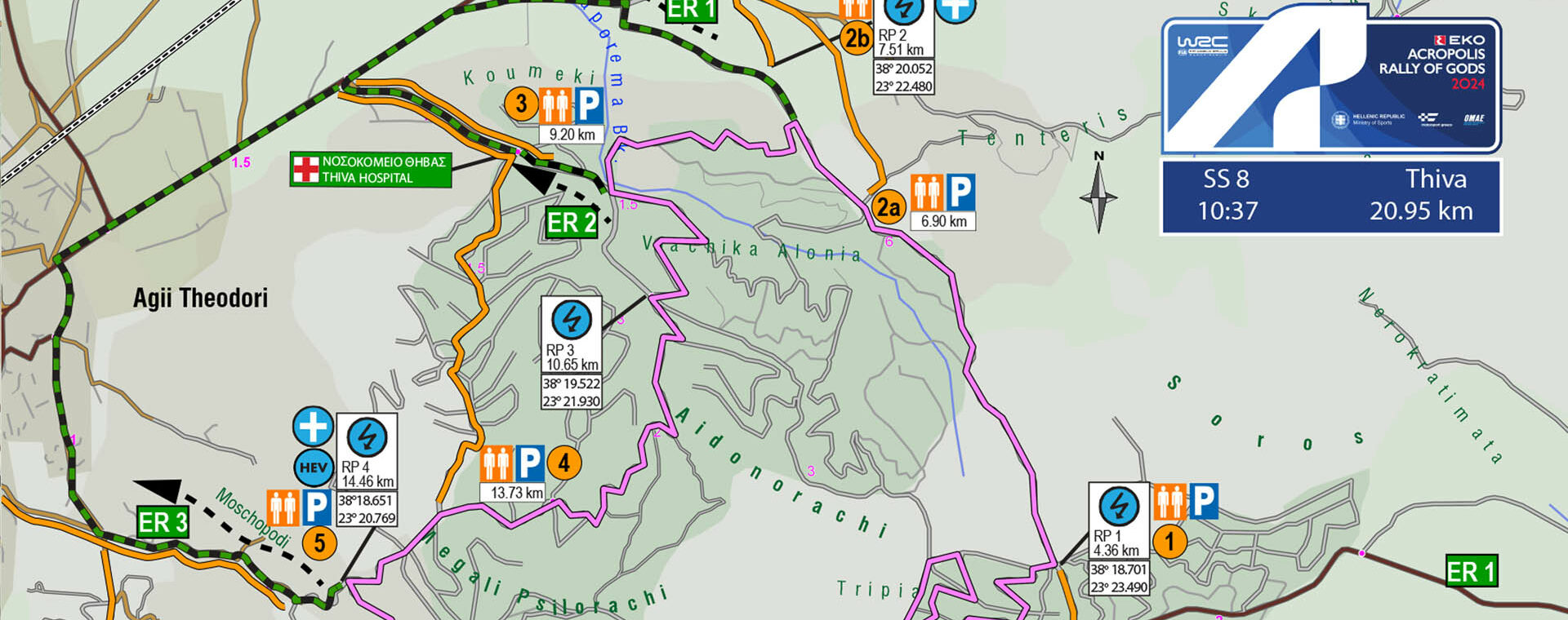 Ερχόμενοι είτε από Θήβα είτε από Ερυθρές, στρίβετε στη διασταύρωση προς το χωριό Νεοχωράκι όπου και μηδενίζετε. Κινούμενοι πλέον στην Επαρχιακή Οδό Νεοχωρακίου-Σχηματαρίου, σε 4,9 χλμ. προσπερνάτε χωματόδρομο αριστερά που οδηγεί στο STOP της ειδικής. Αμέσως μετά θα έχετε αριστερά σας ένα πάρκο κυκλοφοριακής αγωγής και στα δεξιά σας ένα γήπεδο ποδοσφαίρου. Στο τέλος και των δύο περιφράξεων στρίβετε αριστερά σε βατό χωματόδρομο, όπου ταμπέλα «ΠΡΟΣ ΠΙΣΤΑ ΜΗΧΑΝΟΚΙΝΗΤΟΥ ΑΘΛΗΤΙΣΜΟΥ MOTOCROSS ΘΗΒΑΣ». Σε 1,4 χλμ. ακολουθείτε τον στενό δρόμο στα αριστερά, και αμέσως βγαίνετε σε διασταύρωση που στρίβετε αριστερά. Σε 650 μ. θα φτάσετε στο 20,61 χλμ. της ειδικής διαδρομής.