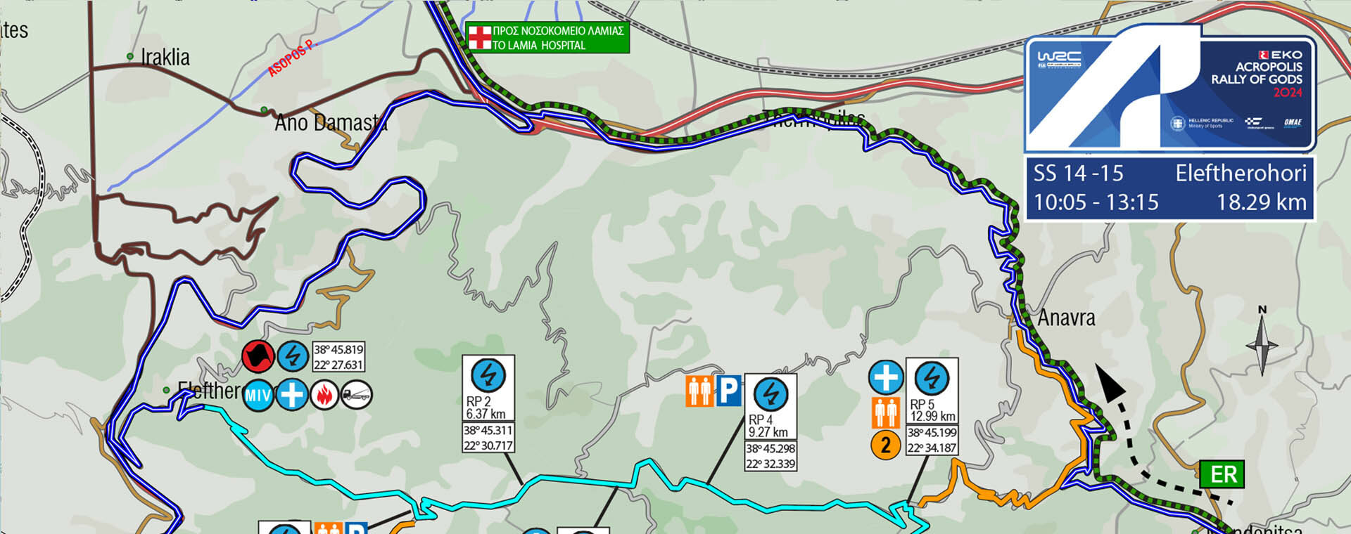 Μία από τις πλέον κλασικές ειδικές διαδρομές του Ράλλυ Ακρόπολις – τουλάχιστον τα τελευταία 25 χρόνια. Ξεκινάει έξω από το Ελευθεροχώρι, ανηφορίζει σχετικά γρήγορα μέχρι την πρώτη λίμνη (η οποία δεν έχει νερό) και μετά μπαίνει στο δάσος, σε ένα πολύ στενό κομμάτι μέχρι τη διασταύρωση της Δριμαίας. Από εκεί ο δρόμος γίνεται πάρα πολύ γρήγορος μέχρι το ύψος της δεύτερης λίμνης (χωρίς νερό). Μετά από περίπου 1,5 χλμ. γίνεται και πάλι πολύ στενός.