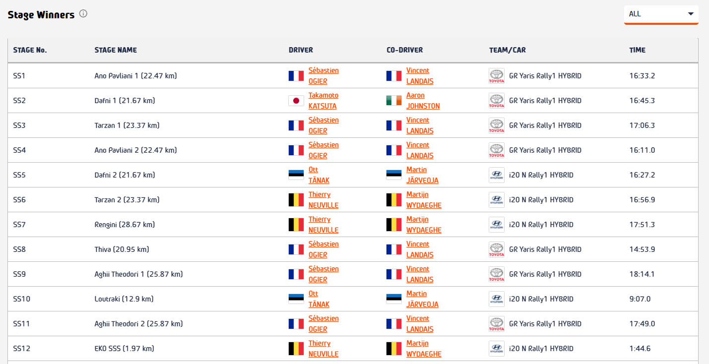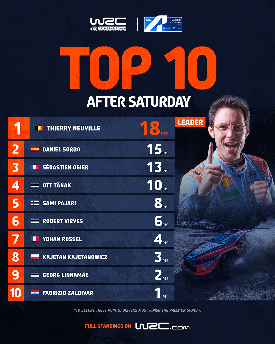 O Thierry Neuville με το Hyundai i20 N Rally1, σημείωσε τον ταχύτερο χρόνο στη σύντομη υπερειδική και με αυτό τον τρόπο ολοκλήρωσε την ημέρα του Σαββάτου στην 1η θέση της γενικής κατάταξης, για να «κλειδώσει» 18 βαθμούς, τους οποίους θα λάβει (όπως και όλοι οι υπόλοιποι) αν τερματίσει την Κυριακή.