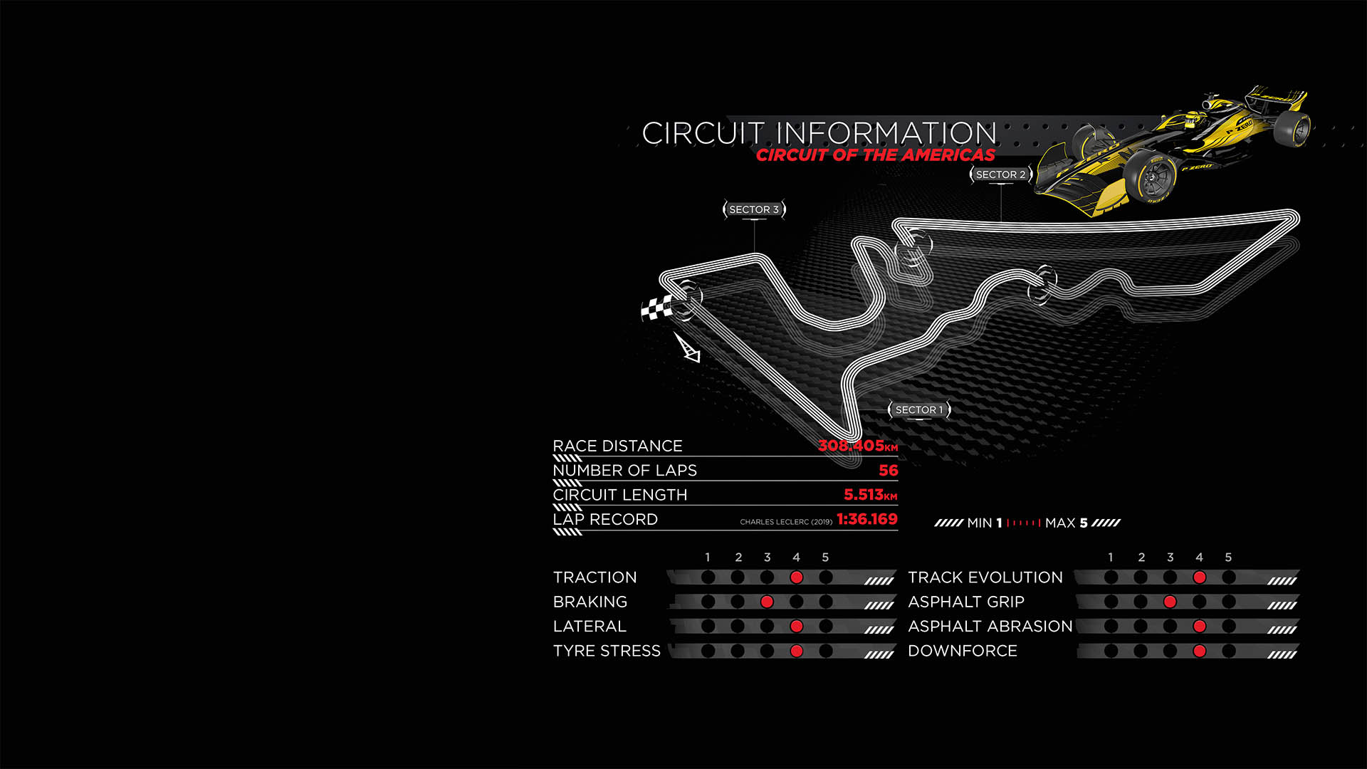 Το αριστερόστροφο Austin απαιτεί αρκετά υψηλά επίπεδα αεροδυναμικού φορτίου και το DRS έχει αρκετά μεγάλη επίδραση. Συνεπώς, τα μονοθέσια θα είναι εξοπλισμένα με μεγάλες πίσω αεροτομές. Στις γρήγορες στροφές του 1ου sector τα μονοθέσια χρειάζονται ένα ισχυρό εμπρός μέρος στις ταχύτατες αλληλένδετες στροφές, όπου μπορεί να χαθεί πολύς χρόνος, καθώς ένα λάθος σε μία από αυτές επηρεάζει όλες όσες ακολουθούν.