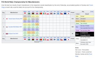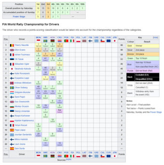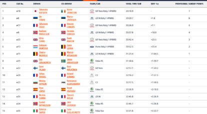 O Elfyn Evans τερμάτισε στη 2η θέση, αλλά σημείωσε τους ίδιους βαθμούς με τον Thierry Neuville, νικητή του Σαββάτου, που είχε ξεκινήσει δυναμικά τον αγώνα, έχοντας εκμεταλλευτεί την πρώτη ημέρα το γεγονός ότι εκκινούσε πρώτος στις ασφάλτινες ειδικές διαδρομές και συναντούσε καλύτερες συνθήκες, καθώς δεν οι δρόμοι είχαν γεμίσει με λάσπες από τα περάσματα των αυτοκινήτων.