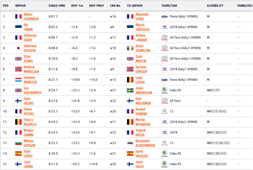 Στην 7η θέση κατετάγη ο Gregoire Munster με το δεύτερο Ford Puma, ενώ ο Ρώσος (που αγωνίζεται με βουλγαρική άδεια) Nikolay Gryazin κατέκτησε τη νίκη στο WRC2, οδηγώντας Citroen C3 Rally2, με διαφορά 38 δλ. από τον Γάλλο Yohan Rossel, με ίδιο αυτοκίνητο. Ο Φινλανδός Sami Pajari (Toyota GR Yaris Rally2), συμπλήρωσε το βάθρο του WRC2.