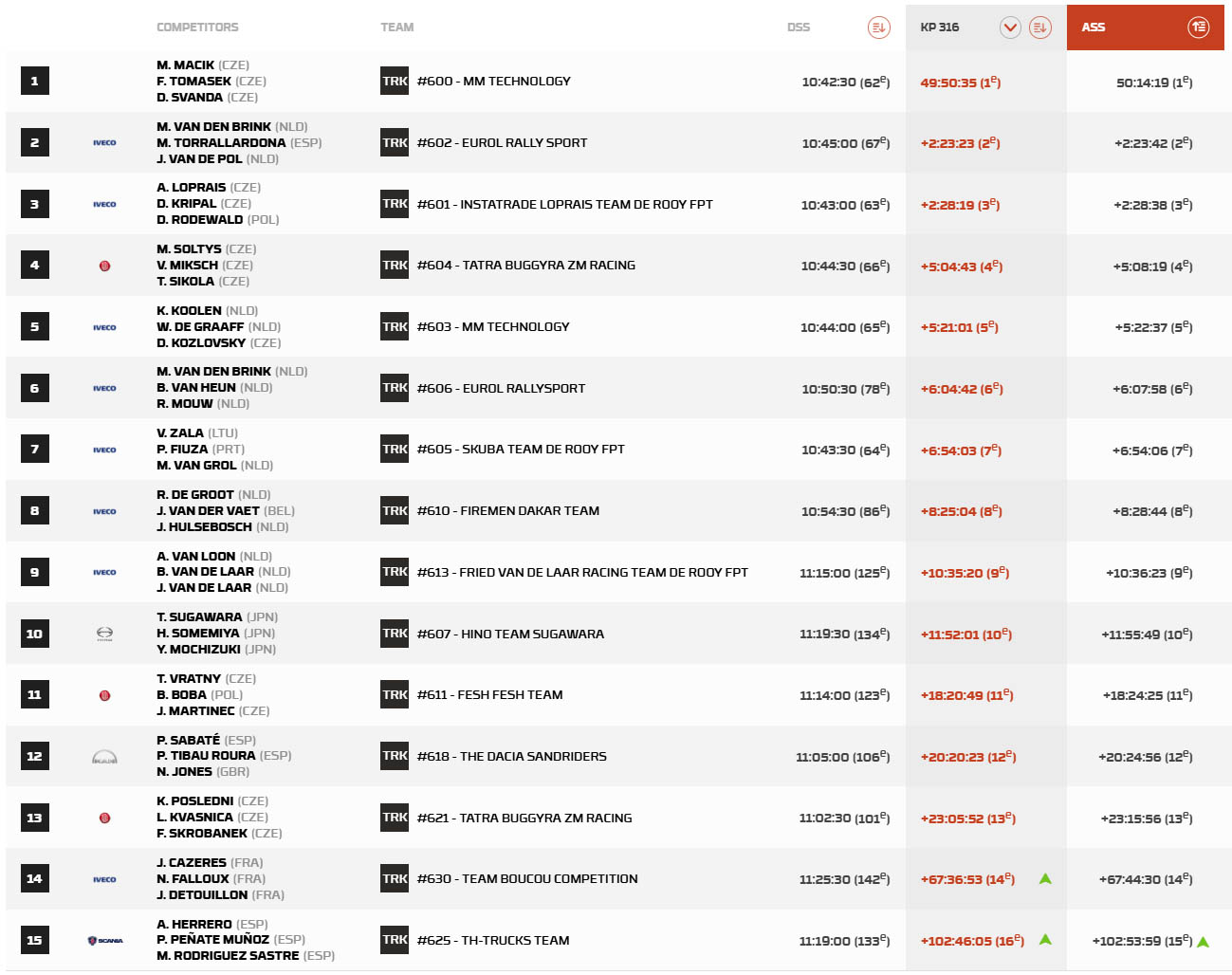 Στην κατηγορία των φορτηγών, ο Τσέχος Ales Loprais (Iveco) κατέκτησε την 3η φετινή του νίκη σε ειδική διαδρομή του αγώνα. Αυτό του επέτρεψε να πλησιάσει στη γενική κατάταξη σε απόσταση μικρότερη των 5 λεπτών τον Ολλανδό Mitchel van den Brink (Iveco), ο οποίος σημείωσε τον 2ο χρόνο της ημέρας. Οι δυο τους μάχονται για τη 2η θέση της γενικής κατάταξης, περισσότερες από 2 ώρες και 20 λεπτά πίσω από τον Τσέχο επικεφαλής Martin Macik (ΜΜ Technology), που προηγείται σταθερά.