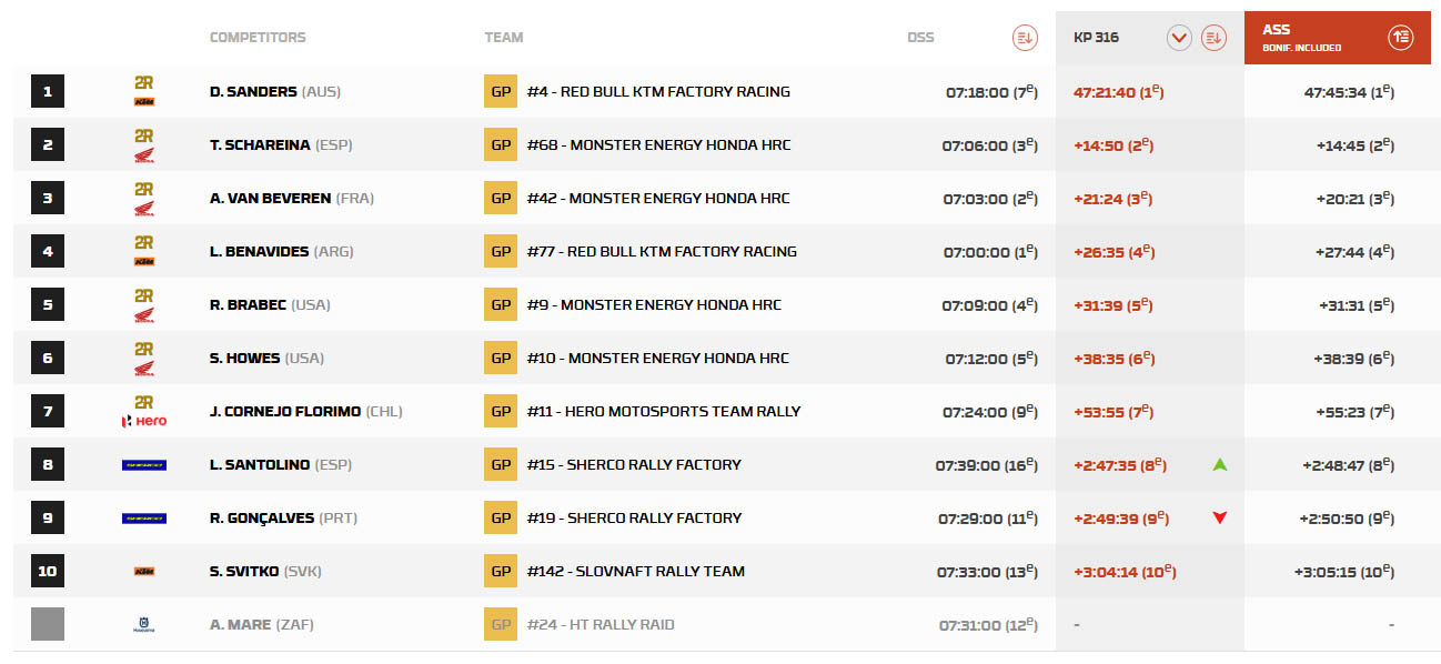 Έτσι, η KTM έχει σημειώσει φέτος 7 νίκες σε ειδικές διαδρομές για πρώτη φορά από το 2018. Όπως και εχθές, ο Γάλλος Adrien Van Beveren (Honda) ήταν δεύτερος στους χρόνους της ημέρας, 1:54” πίσω, ενώ την πρώτη τριάδα συμπλήρωσε ο Αυστραλός επικεφαλής της γενικής κατάταξης, Daniel Sanders (KTM).