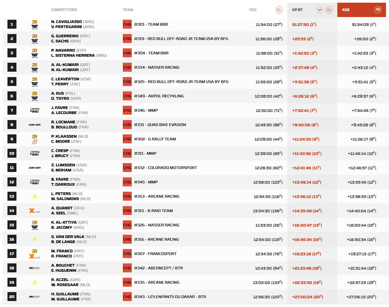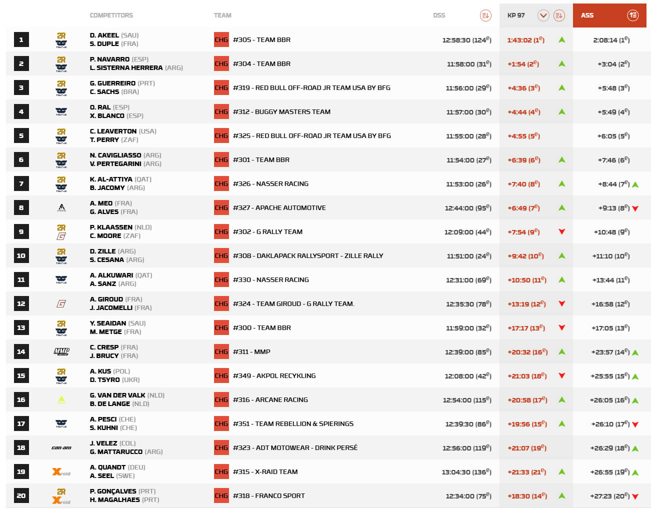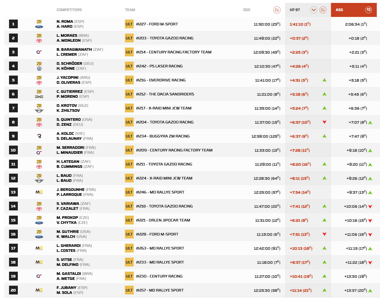 Στη γενική κατάταξη, το ζεύγος Αργεντίνων Nicolas Cavigliasso / Valentina Pentegarini (BBR) εξακολουθεί να προηγείται και συνεχίζει να πηγαίνει με ελεγχόμενο ρυθμό, διατηρώντας τη διαφορά που το χωρίζει από τον Guerreiro στα 26 λεπτά. Ο Ολλανδός Paul Spierings (Rebellion), που βρισκόταν στην 3η θέση της γενικής κατάταξης, σταμάτησε στο 506ο χλμ. της απλής διαδρομής και ανέφερε στον ασύρματο ότι θα χρειαζόταν 2 ώρες για να επισκευάσει το Taurus Τ3 Max που οδηγεί. Συνεπώς, στην 3η θέση ανέβηκε ο Pau Navarro.