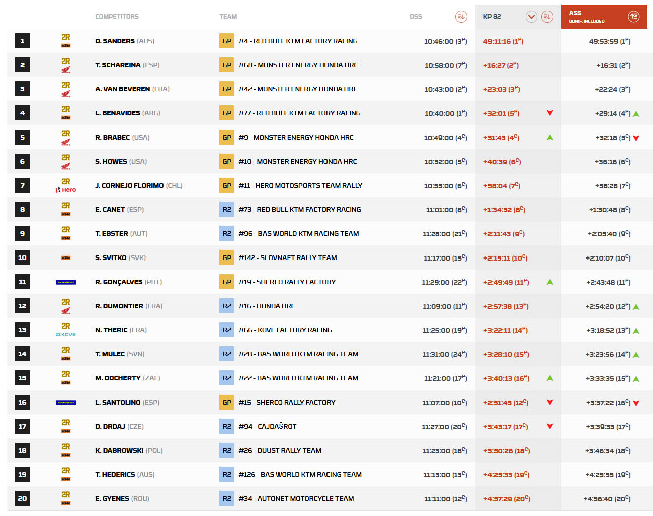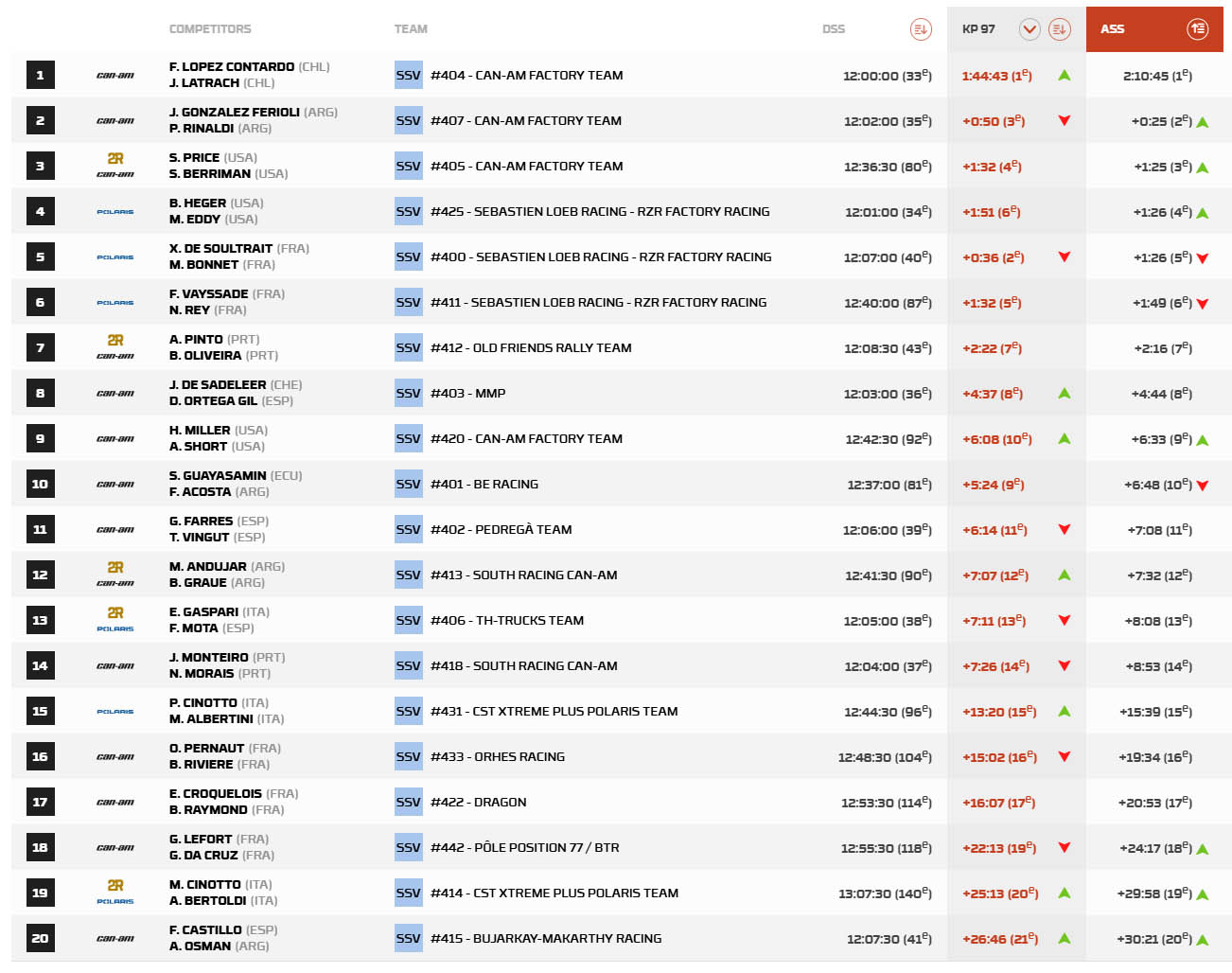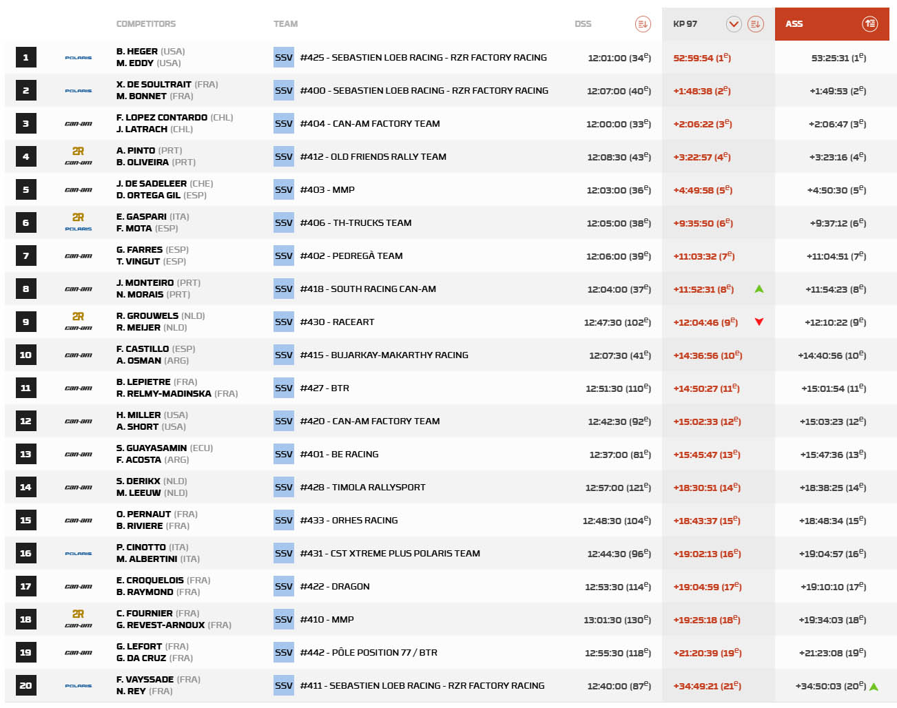 Στη γενική κατάταξη, θα πρέπει να συμβεί κάτι πολύ σοβαρό για να χάσει ο Αμερικανός Brock Heger με το Polaris της ομάδας του Sebastien Loeb τη νίκη στο ντεμπούτο του, αφού προηγείται με διαφορά 1 ώρας και 50 λεπτών σχεδόν από τον Γάλλο team-mate του, Xavier de Soultrait, με τον σημερινό νικητή ‘Chaleco’ Lopez 17 λεπτά πιο πίσω.
