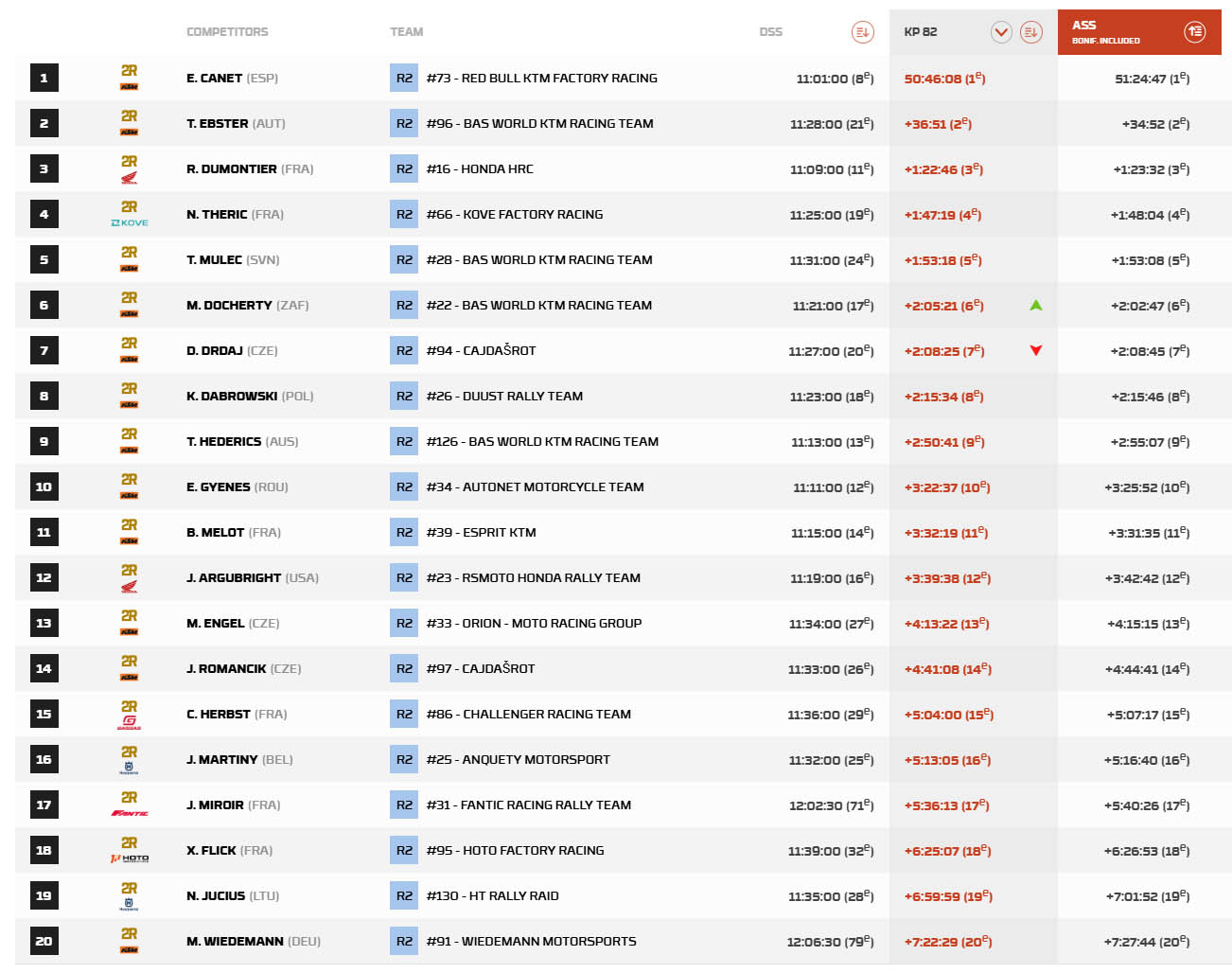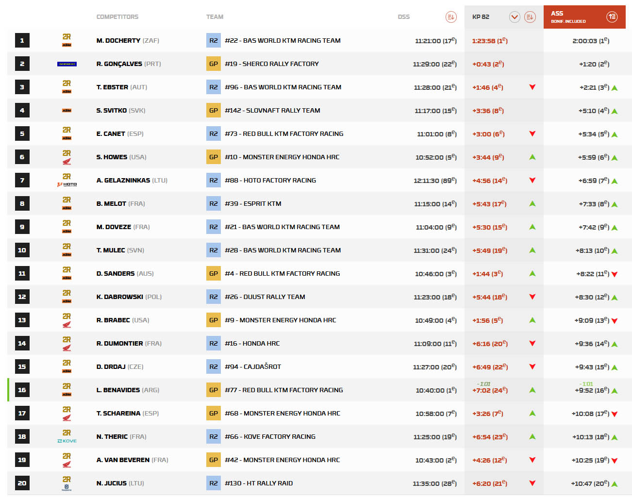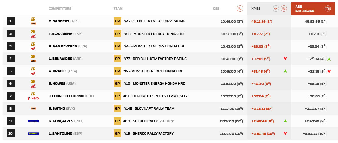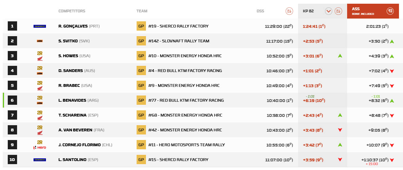 Στη γενική κατάταξη, θα πρέπει να συμβεί κάτι πολύ σοβαρό για να χάσει ο Αμερικανός Brock Heger με το Polaris της ομάδας του Sebastien Loeb τη νίκη στο ντεμπούτο του, αφού προηγείται με διαφορά 1 ώρας και 50 λεπτών σχεδόν από τον Γάλλο team-mate του, Xavier de Soultrait, με τον σημερινό νικητή ‘Chaleco’ Lopez 17 λεπτά πιο πίσω.