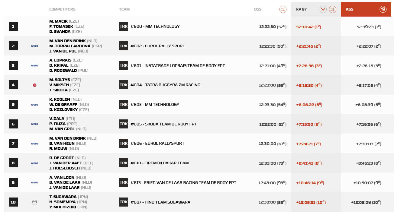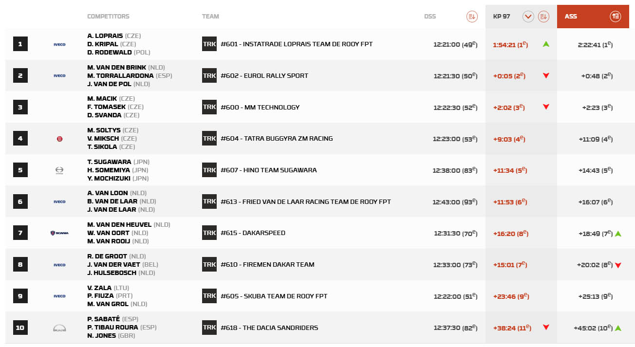 Στην κατηγορία των φορτηγών, ο Τσέχος Ales Loprais συνέχισε τις νίκες με το Iveco, αλλά κέρδισε μόλις 48 δλ. από τον Ολλανδό Mitchel van den Brink στη γενική κατάταξη, όπου τους χωρίζουν μόλις 4:07” στη μάχη για τη 2η θέση, καθώς ο Martin Macik (MM Technology) βρίσκεται 2 ώρες και 22 λεπτά μπροστά.