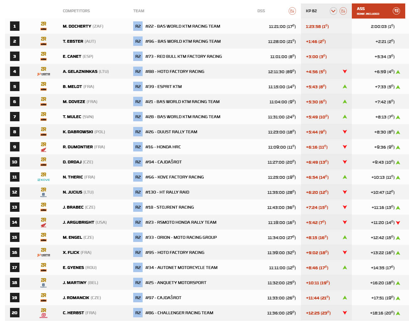 Ο Νοτιοαφρικανός Michael Docherty, έγινε ο δεύτερος οδηγός στην ιστορία του Ράλλυ Ντακάρ που κέρδισε ειδική διαδρομή με μοτοσυκλέτα της κατηγορίας Rally 2 (ΚTΜ της BAS), έπειτα από τον Danilo Petrucci το 2022. Ο Docherty, που υπέστη ένα ελαφρύ κάταγμα στον ώμο στην ΕΔ1 και τον χτύπησε ξανά στην ΕΔ6, έγινε ο δεύτερος Νοτιοαφρικανός που κερδίσει ειδική διαδρομή του Ράλλυ Ντακάρ στις μοτοσυκλέτες (έπειτα από τον Alfie Cox το 2003), διαμένει δίπλα από την έρημο του Empty Quarter, και γνωρίζει καλά την περιοχή.