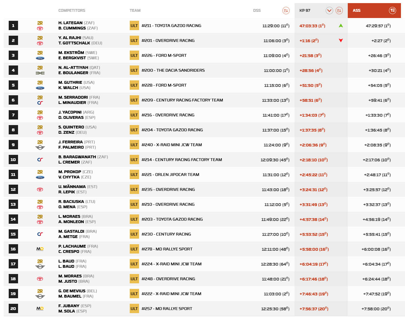 Στη γενική κατάταξη, ο έτερος οδηγός της M-Sport Ford, ο Σουηδός Mattias Ekstrom, αν και έχασε έδαφος σε σχέση με τον επικεφαλής Lategan (περίπου 2 λεπτά), πήρε μία «ανάσα» στη μάχη του με τον Καταριανό Nasser Al-Attiyah. O οδηγός της Dacia, έχοντας κερδίσει τη χθεσινή ειδική διαδρομή, εκκινούσε από την πρώτη θέση σήμερα και άνοιγε το δρόμο για τους υπόλοιπους.