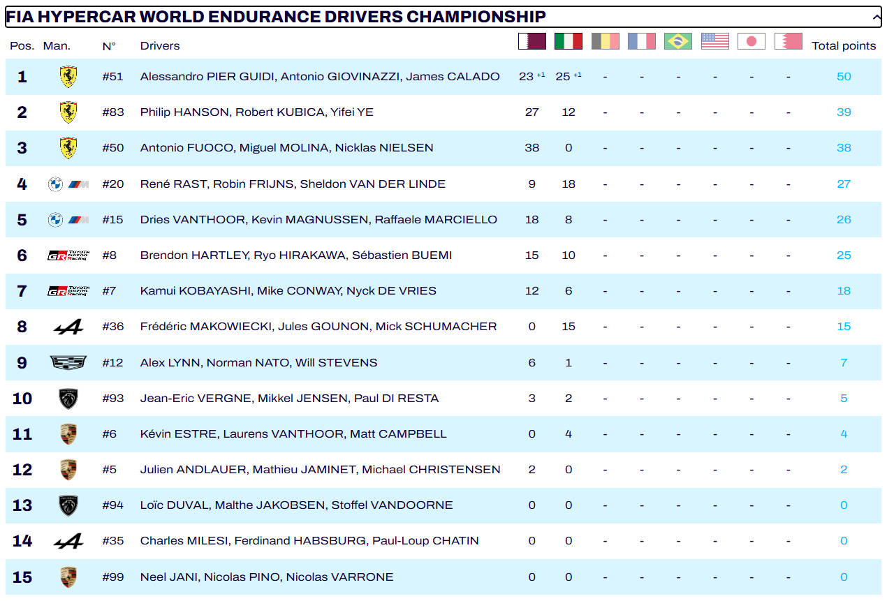 Η BMW #15 ήταν άλλος ένας πρωταγωνιστής του βάθρου πριν τελικά υποχωρήσει στην 6η θέση, μπροστά από την Toyota #7. Οι Πρωταθλητές του 2024 Kevin Estre και Laurens Vanthoor (Porsche Penske) σημείωσαν τους πρώτους τους βαθμούς στη φετινή σεζόν τερματίζοντας στην 8η θέση. To τρίτο μέλος του πληρώματος, ο Matt Campbell, ξεχώρισε έχοντας αποκρούσει με αυτοπεποίθηση έναν αποφασισμένο Giovinazzi στην 4η ώρα του αγώνα, με ελαστικά που είχαν κάνει περισσότερους γύρους.