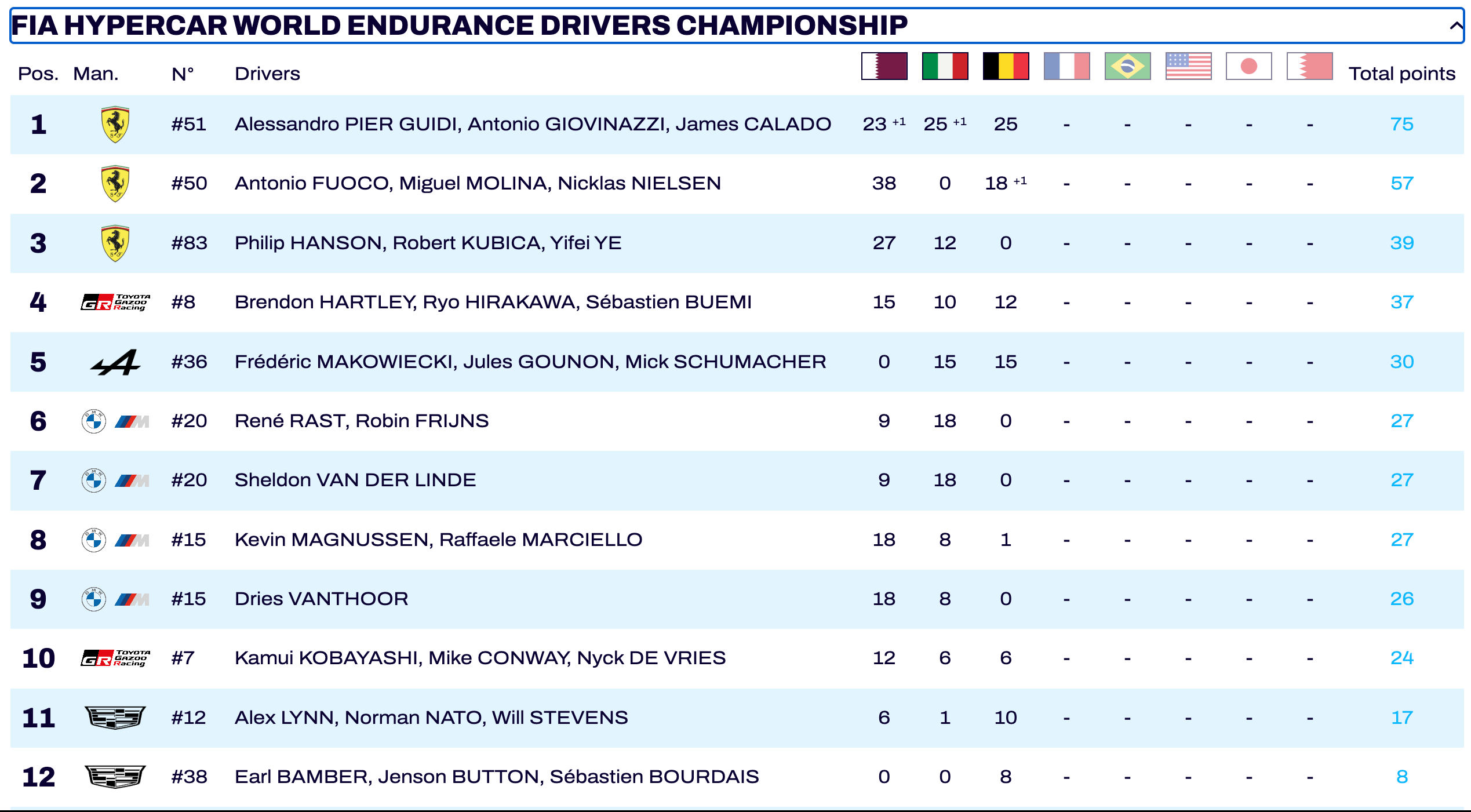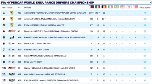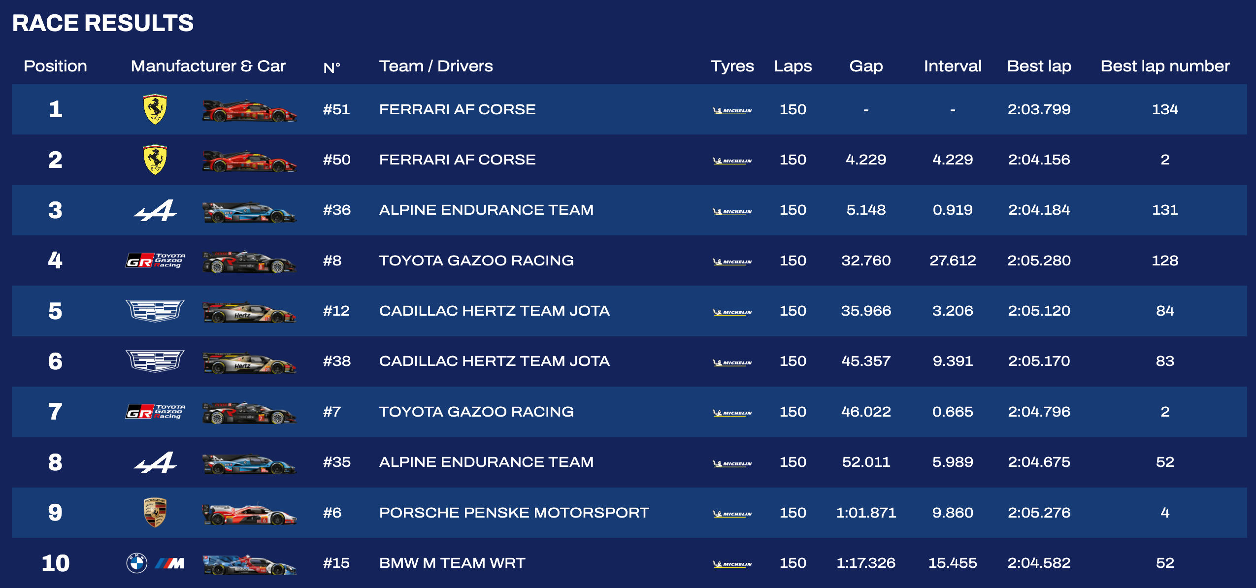 Μάλιστα, όχι μόνο αυτό, αλλά τα πληρώματα της Scuderia κατέλαβαν τις δύο πρώτες θέσεις. Οι James Calado, Antonio Giovinazzi και Alessandro Pier Guidi (#51) κατέκτησαν τη νίκη στις 6 ώρες του Spa με διαφορά μόλις 4 δευτερολέπτων από την άλλη Ferrari 499P Le Mans Hypercar #50 των Nicklas Nielsen, Miguel Molina και Antonio Fuoco.