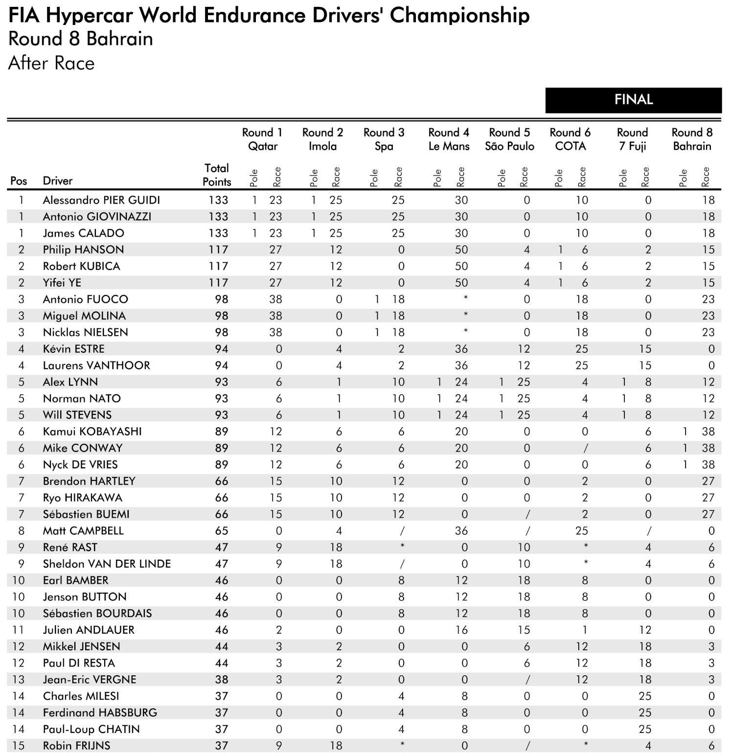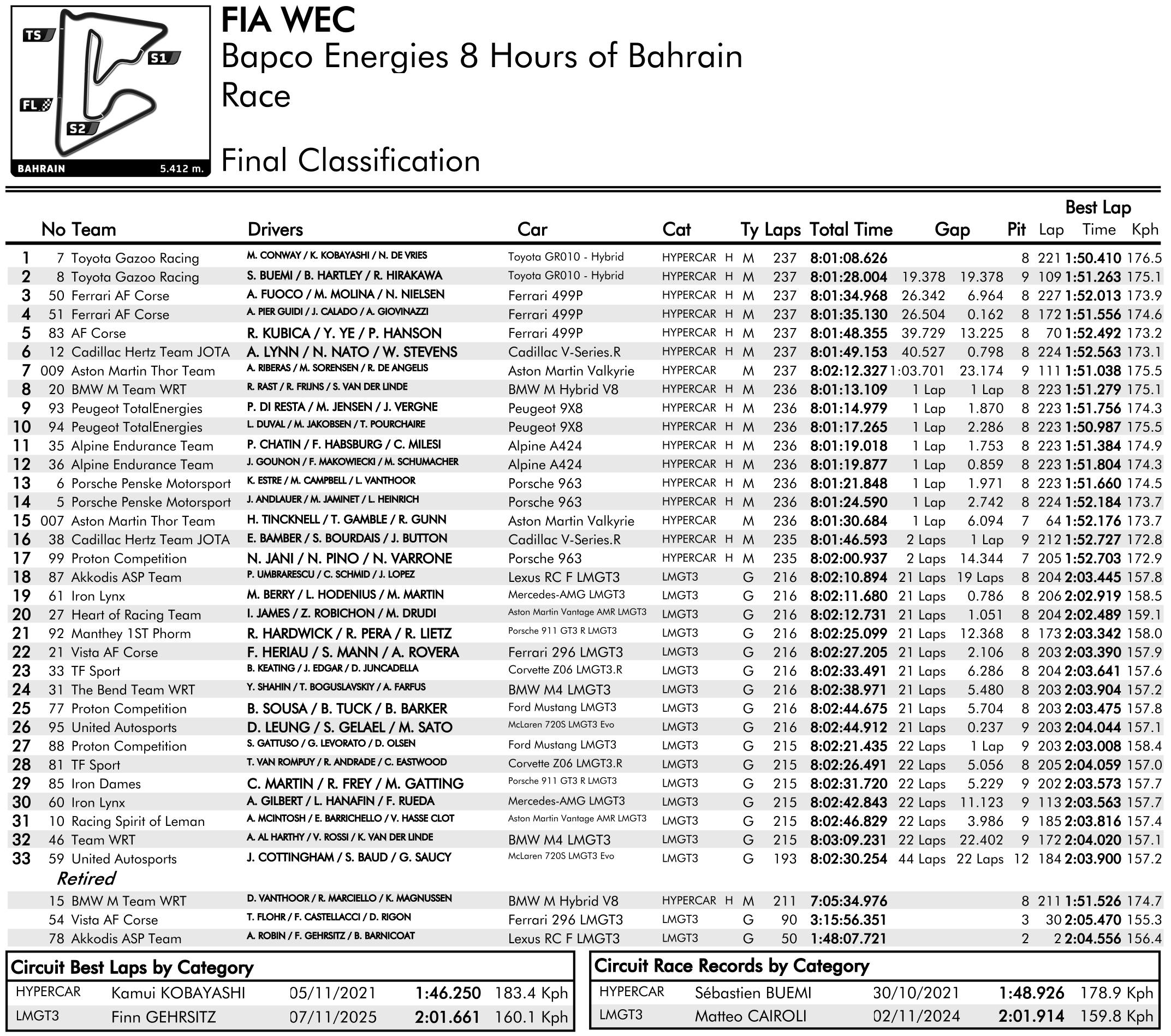 Ο Buemi αντιστάθηκε στην επίθεση της Ferrari #51 του Pier Guidi στα τελικά στάδια, για να εξασφαλίσει τη 2η θέση. Οι Porsche δεν ήταν ανταγωνιστικές στο Sakhir, με την εργοστασιακή ομάδα να αποχωρεί από το WEC με έναν αγώνα όπου οι 963 τερμάτισαν στη 13η και 14η θέση, ενώ υπήρχαν -αμυδρές- ελπίδες να διεκδικήσουν τον τίτλο κατασκευαστών. Η Cadillac με το πλήρωμα των Alex Lynn, Norman Nato και Will Stevens, τερμάτισε στην 6η θέση.