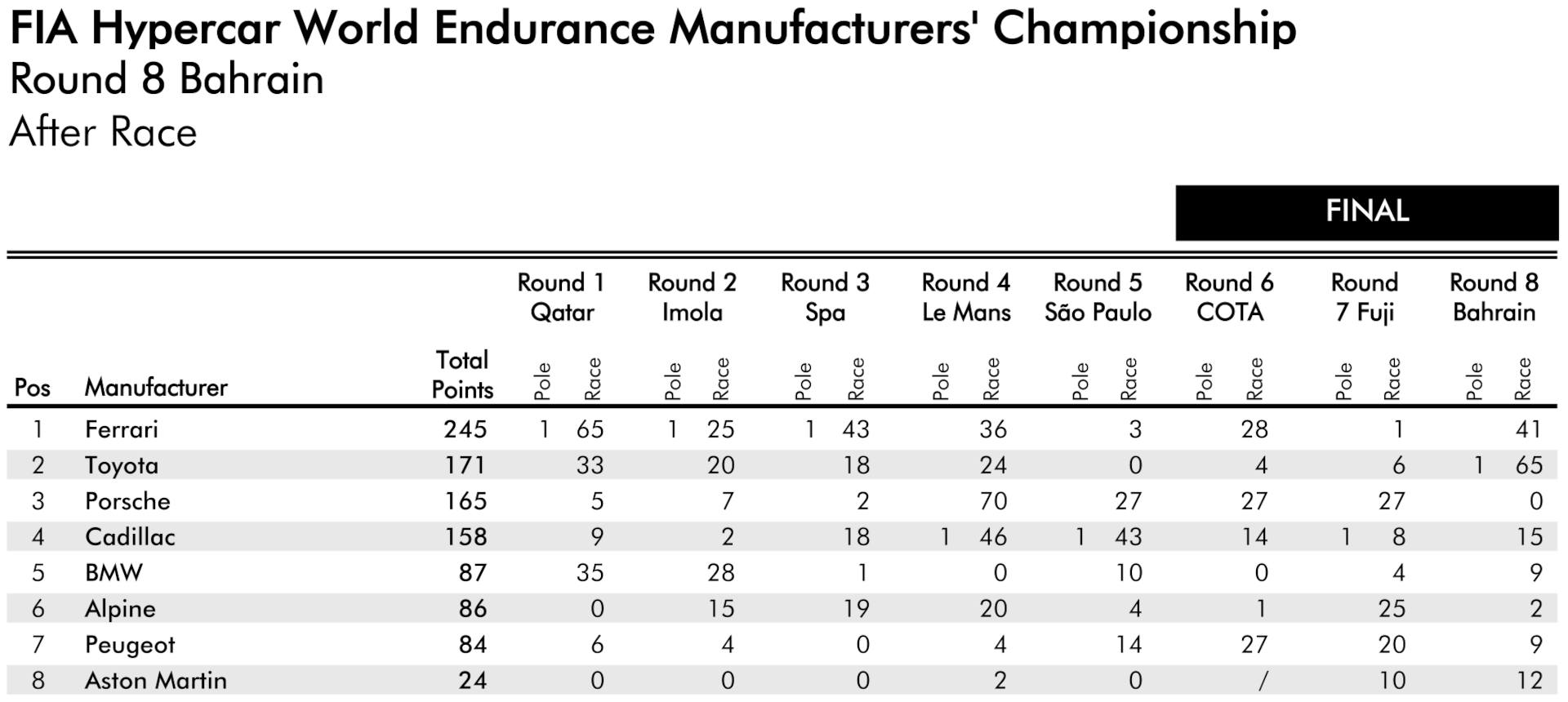 Στις 8 Ώρες του Μπαχρέιν που ολοκλήρωσαν τη φετινή σεζόν του Παγκόσμιου Πρωταθλήματος Αντοχής (WEC), η Ferrari είδε τα αυτοκίνητά της να τερματίζουν στην 3η και 4η θέση, αποτέλεσμα που ήταν αρκετό για να κατακτήσει το νταμπλ και να πάρει τους πρώτους τίτλους της σε αγώνες σπορ πρωτότυπων έπειτα από 53 χρόνια, από το μακρινό 1972.