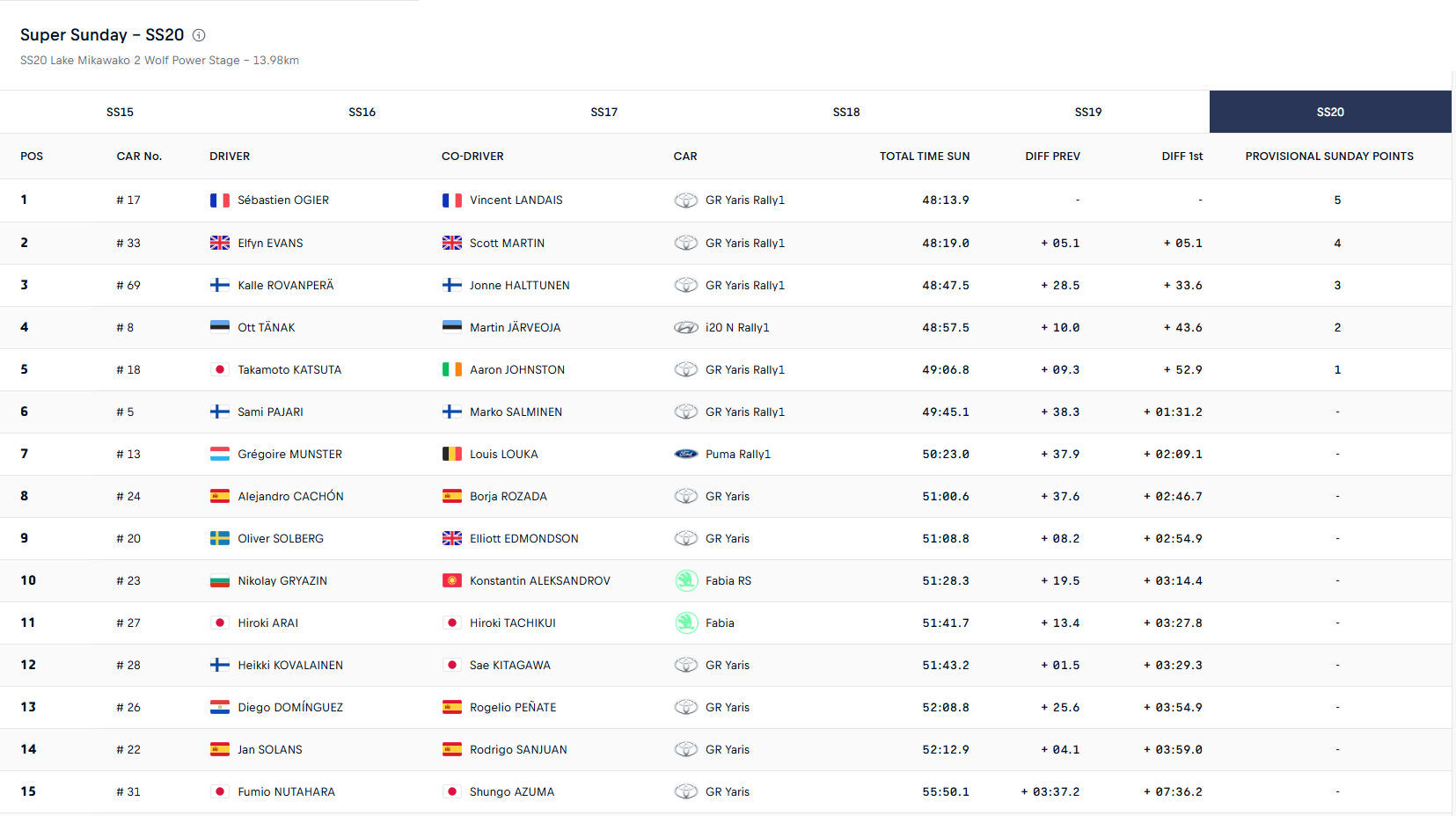 Η εγκατάλειψη του Fourmaux το πρωί της Κυριακής ανέβασε τον Sami Pajari στην 3η θέση, με τον νεαρό Φινλανδό οδηγό της Toyota να ανέβει στο βάθρο στην πορεία του στο WRC στη 16η συμμετοχή στην ανώτερη κατηγορία Rally1. Ο Pajari βρισκόταν στην 5η θέση για το μεγαλύτερο μέρος του αγώνα, αλλά πέρασε 4ος μετά την εγκατάλειψη του Takamoto Katsuta το Σάββατο, όταν ο τοπικός ήρωας έσπασε το υδραυλικό τιμόνι του Toyota GR Yaris Rally1 του, έχοντας προσκρούσει σε πλαστικές μπαριέρες στην ειδική διαδρομή του Mt. Kasagi.