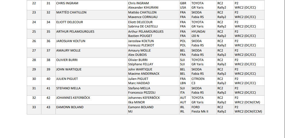 Οι συμμετέχοντες του WRC2 είναι 27 με τα πιο σημαντικά ονόματα να είναι αυτά των Nikolay Gryazin και Yohan Rossel με την Lancia Ypsilon Integrale HF Rally2. O Romet Jurgenson εξασφάλισε την εργοστασιακή υποστήριξη της M-Sport Ford και θα βρεθεί πίσω από το τιμόνι του Fiesta MKII Rally2. Οι Leo Rossel και Pablo Sarrazin θα οδηγήσουν ένα Citroen C3 Rally2 ενώ οι Yuki Yamamoto και Chris Ingram θα είναι οι αντιπροσωπευτικοί οδηγοί της Toyota με το GR Yaris Rally2. Τέλος, ο Eric Camilli και ο Robert Dapra θα οδηγήσουν ένα Skoda Fabia RS Rally2.