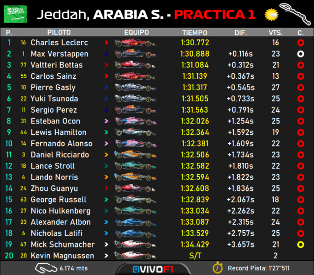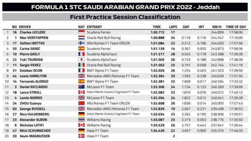 Ο Charles Leclerc, που προηγείται για πρώτη φορά στην καριέρα του στη βαθμολογία του Πρωταθλήματος και είναι ο πρώτος Μονεγάσκος που καταφέρνει κάτι τέτοιο, έγραψε τον ταχύτερο χρόνο του FP1 στο Grand Prix Σαουδικής Αραβίας με τη Ferrari να χρησιμοποιεί τη μαλακή γόμα. Ο Lelcerc σημείωσε τον ταχύτερο χρόνο του με τη δεύτερη γρήγορη προσπάθεια με το συγκεκριμένο σετ στα τελικά στάδια. Μάλιστα, στην τελευταία του προσπάθεια, ο Μονεγάσκος ήταν ακόμη ταχύτερος στο πρώτο τμήμα της πίστας, αλλά έκανε ένα λάθος στη στροφή 16, ακολουθώντας ένα άλλο μονοθέσιο από κοντά. Νωρίτερα, είχε χάσει το pit της Ferrari, χωρίς κάποια συνέπεια.