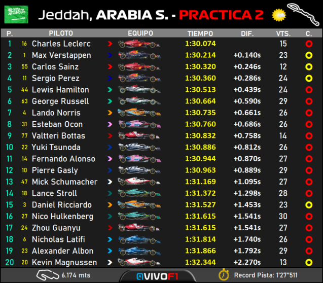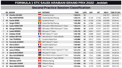 Ο Charles Leclerc κατάφερε να σημειώσει τον ταχύτερο χρόνο της δεύτερης περιόδου του GP Σαουδικής Αραβίας, αλλά καμία από τις δύο Ferrari δεν πραγματοποίησε προσομοίωση αγώνα. Ο Leclerc προκάλεσε ζημιά στο σύστημα διεύθυνσης της F1-75 όταν χτύπησε στον τοίχο της εσωτερική της στροφής 4. Ο Carlos Sainz (3ος) επίσης χτύπησε τον τοίχο στη στροφή 13 με αποτέλεσμα τα δύο ιταλικά μονοθέσια να παραμείνουν εντός των pits κατά τη διάρκεια του τελευταίου 20λεπτου της διαδικασίας. O Sainz εξέφρασε έντονα παράπονα για τα προβλήματα ταλαντώσεων που αντιμετώπισε.