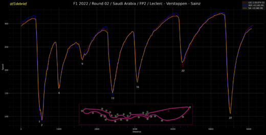 Ο Leclerc σημείωσε την ταχύτερη επίδοση της ημέρας με τη μαλακή γόμα, αλλά οι τρεις οδηγοί που βρέθηκαν εντός μόλις 0,3 δλ. πίσω από το Μονεγάσκο, σημείωσαν τον ταχύτερο χρόνο τους χρησιμοποιώντας τη μέση γόμα. Στη 2η θέση βρέθηκε και πάλι ο Max Verstappen, μόλις 140 χλστ. του δλ. πίσω από τον Leclerc, ενώ στην 4η θέση ήταν ο Sergio Perez, ο οποίος παραπονέθηκε για έλλειψη πρόσφυσης σε αμφότερους τους άξονες, αλλά περισσότερο στον πίσω. Ο Μεξικανός ακούστηκε απελπισμένος, μη γνωρίζοντας ποια οδό να ακολουθήσει για να επιλύσει τα προβλήματα. Είδαμε για πρώτη φορά τη Red Bull να παρουσιάζει ταλαντώσεις επάνω από τα 280 χλμ./ώρα, αλλά σε πολύ πιο ελεγχόμενη ένταση.