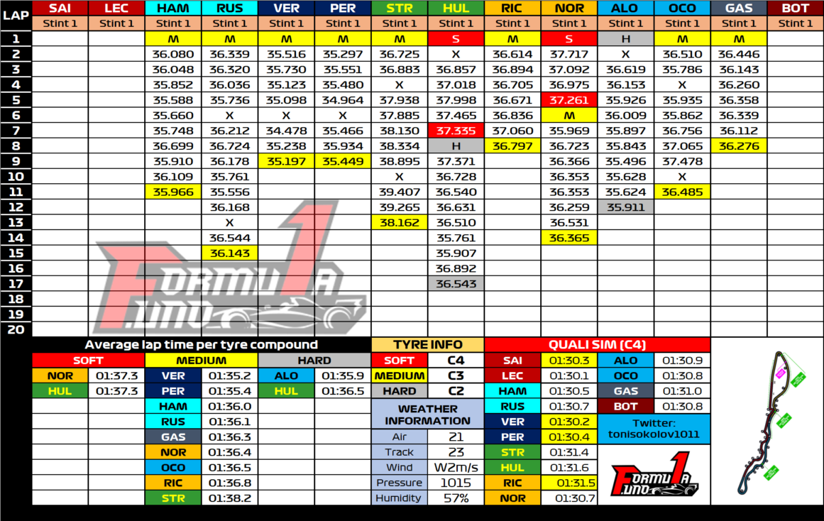 Θετικός για τη McLaren ήταν o χρόνος που είχε τη δυνατότητα να γράψει ο Lando Norris, 661 χλστ. του δλ. πίσω από τον Leclerc. Tον Βρετανό ακολούθησαν οι Esteban Ocon, Valtteri Bottas και Yuki Tsunoda. Στις χαμηλότερες θερμοκρασίες, η AlphaTauri έπεσε μερικές θέσεις. Ο Tsunoda αντιμετώπισε ένα πρόβλημα με τη μονάδα ισχύος στο τέλος της διαδικασίας και αναγκάστηκε να παρκάρει το μονοθέσιο στην πίστα. Eπίσης, οι μηχανικοί της Alfa Romeo πραγματοποιούσαν εργασίες στο μονοθέσιο του Bottas στο τέλος της διαδικασίας, ενώ και ο Kevin Magnussen αντιμετώπισε και πάλι προβλήματα. Ο Δανός είχε ακούσει μερικούς περίεργους θορύβους από τη μονάδα ισχύος του, αλλά μέσω ασυρμάτου η ομάδα τον ενημέρωσε ότι μπορούσε να συνεχίσει κανονικά. Ωστόσο, ανεβαίνοντας στο kerb της στροφής 8, εμφανίστηκε πρόβλημα το οποίο τον ανάγκασε να παρκάρει στην πίστα τη Haas.