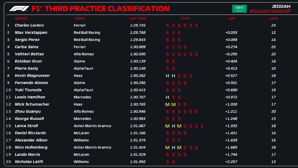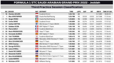 Στη Ferrari του Carlos Sainz, που σημείωσε τον 4ο χρόνο, το φαινόμενο των ταλαντώσεων ήταν και πάλι πολύ έντονο στην προσέγγιση της στροφής 13, γεγονός που ενδέχεται επίσης να επηρεάζει την απόδοση της F1-75 στα ταχύτατα κομμάτια της Jeddah. O λόγος για τον οποίο η Red Bull έδειξε και πάλι καλύτερη στην πίστα, ήταν ότι ο Max Verstappen, στην τελευταία του γρήγορη προσπάθεια, ήταν 3 δέκατα του δλ. ταχύτερος μέχρι να φτάσει στη στροφή 22, όπου έκανε ένα λάθος και βγήκε εκτός πίστας. Συνεπώς, οι Red Bull μπορούν να αντλήσουν περαιτέρω απόδοση από την RB18. Απόδειξη ήταν και το γεγονός ότι και ο Sergio Perez βρέθηκε εμπρός από τον Carlos Sainz, με τους τρεις πρώτους να βρίσκονται εντός ενός δεκάτου του δλ. μεταξύ τους.
