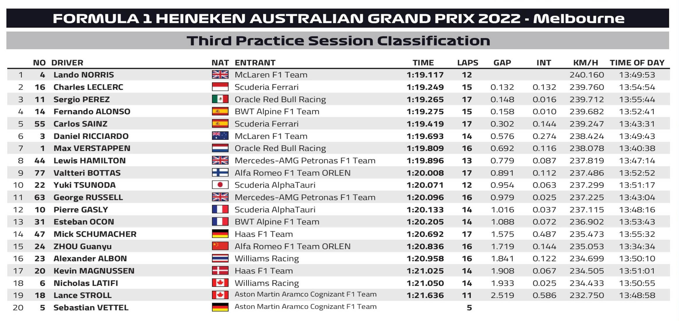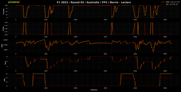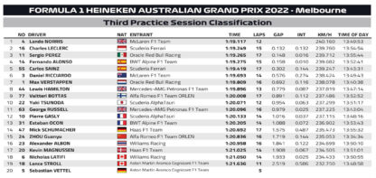 H McLaren έκανε την έκπληξη στο Albert Park, με τον Lando Norris να σημειώνει τον ταχύτερο χρόνο της διαδικασίας, σημειώνοντας πολύ καλή επίδοση στο απαιτητικό τρίτο τμήμα της πίστας με τις αργές στροφές. Ενδεχομένως η McLaren ήταν πιο κοντά σε ρυθμίσεις κατατακτήριων δοκιμών, για να δώσει καλύτερη αίσθηση στους οδηγούς της με τις αλλαγές που έχουν πραγματοποιηθεί στο στήσιμο και τις αναβαθμίσεις που έχουν παρουσιαστεί. O Norris κλήθηκε να επιστρέψει εσπευσμένα στα pits με προληπτικές ρυθμίσεις στον κινητήρα, προς το τέλος της διαδικασίας, πριν την κόκκινη σημαία που έφερε πρόωρο τέλος. Σύμφωνα με τον διευθυντή της McLaren, Andreas Seidl, ο Norris είχε ελάχιστα καύσιμα στο ρεζερβουάρ, για αυτό και δέχθηκε το μήνυμα αυτό στον ασύρματο.