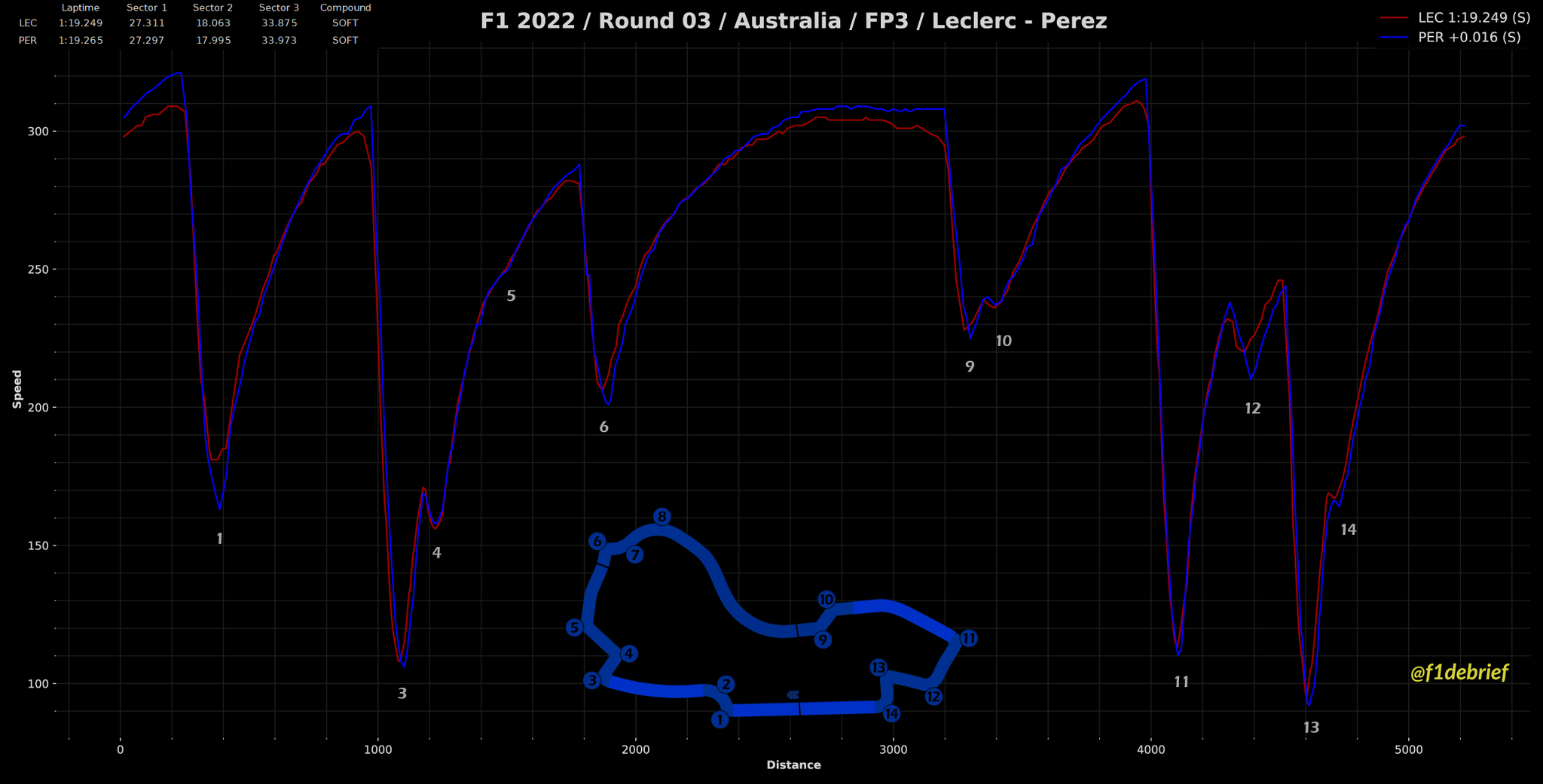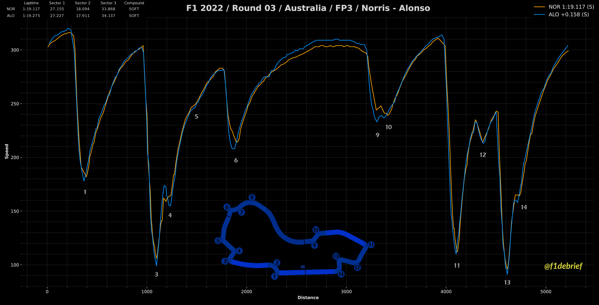 Κάτι παραπάνω από 1 δέκατο του δλ. πίσω από τον Βρετανό βρέθηκαν οι Charles Leclerc και Sergio Perez με διαφορά μόλις 16 χλστ. του δλ. μεταξύ τους. Μόλις 10 χλστ. του δλ. πίσω από τον Μεξικανό, ήταν ο εκπληκτικός Fernando Alonso, που είχε διαφορά 0,9 δλ. από τον team-mate του στην Alpine, Esteban Ocon (13ος). O Ισπανός χρησιμοποιούσε λεπτή πίσω αεροτομή και μαλακές ρυθμίσεις στις αναρτήσεις, χωρίς να αντιμετωπίζει έντονες ταλαντώσεις στις ευθείες. Ο Carlos Sainz βρέθηκε στην 5η θέση, εμπρός από τον τοπικό ήρωα Daniel Ricciardo με τη δεύτερη McLaren, ενώ στην 7η θέση κατετάγη ο Max Verstappen, ο οποίος σημείωσε τον ταχύτερο χρόνο του με τη μέση γόμα.