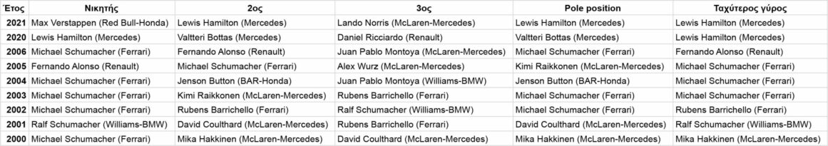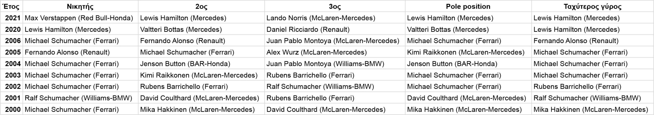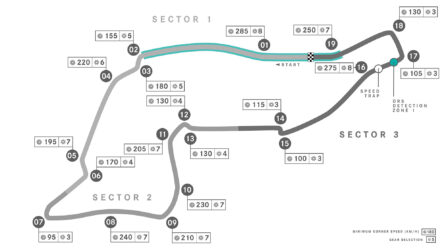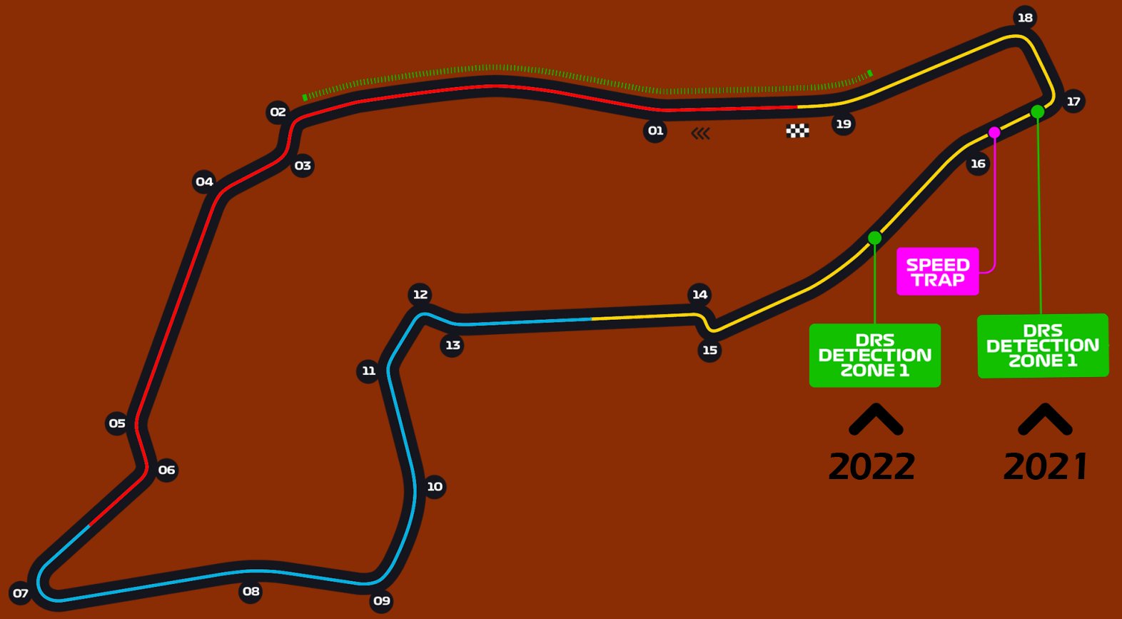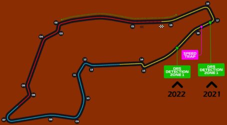 Ζώνες DRS: 1 (μεταξύ των στροφών 19 – 1)