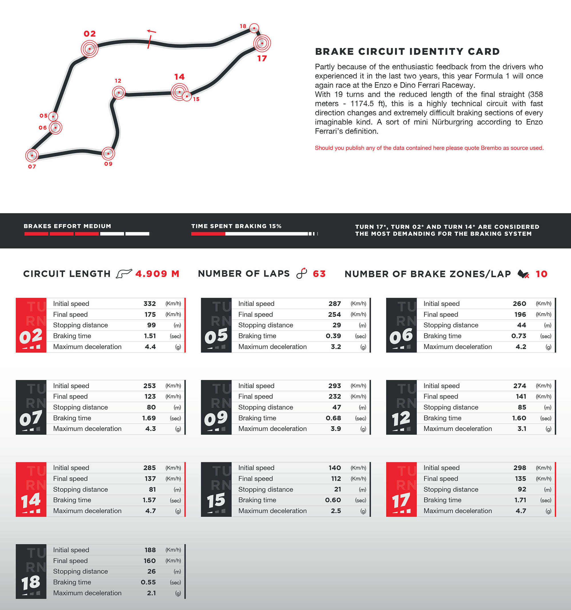 Ο μέσος όρος ταχύτητας διέλευσης από τις κορυφές των στροφών είναι 205 χλμ./ώρα, χαμηλότερος μόνο από αυτόν του Silverstone και της Suzuka. Η Imola διαθέτει μεγάλη ποικιλία τύπου στροφών, γεγονός που κάνει πιο δύσκολο να βρεθεί ο κατάλληλος συμβιβασμός στο στήσιμο των μονοθεσίων. Οι ανομοιομορφίες του ασφαλτοτάπητα κάνουν επίσης τη ρύθμιση της απόστασης από το έδαφος αρκετά δύσκολη, ιδίως με την πρόκληση των ταλαντώσεων να εισέρχεται στην εξίσωση.