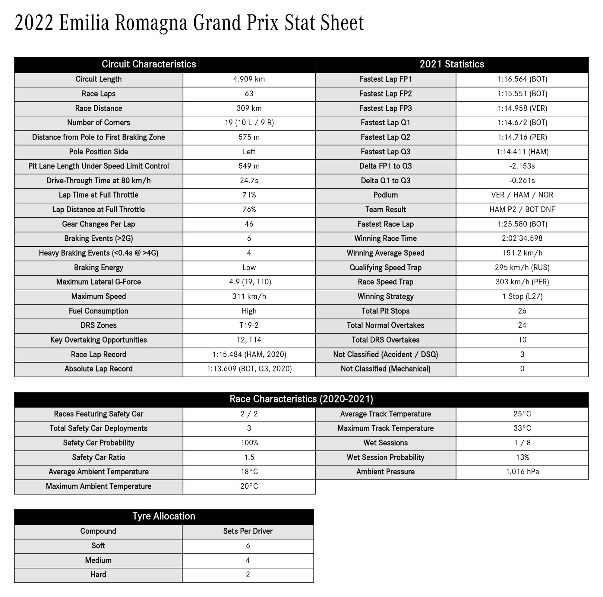 Ο πρώτος ευρωπαϊκός αγώνας της φετινής σεζόν της Formula 1 θα είναι το Grand Prix της Emilia Romagna, στην πίστα Enzo e Dino Ferrari, δίπλα από τον ποταμό Santerno. Θα είναι επίσης ο πρώτος αγώνας της σεζόν εκ των τριών συνολικά των οποίων το τριήμερο περιλαμβάνει σπριντ το Σάββατο και τη διεξαγωγή των κατατακτήριων δοκιμών την Παρασκευή.