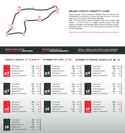 Επειδή πρόκειται για παλιά πίστα, είναι αρκετά στενή, γεγονός που κάνει τα προσπεράσματα δύσκολα, σε συνδυασμό με το γεγονός ότι διαθέτει μόνο μία ζώνη DRS (στην ευθεία εκκίνησης/τερματισμού), το σημείο ανίχνευσης της οποίας έχει μεταφερθεί 365 μ. νωρίτερα στη χάραξη. Η Imola διαθέτει ένα από τα μεγαλύτερα pit lane του Πρωταθλήματος (με μήκος 550 μ.), γεγονός που κάνει τα pit stop πιο χρονοβόρα, καθώς η απώλεια ανέρχεται έως τα 28 δλ. Σε συνδυασμό με την ήπια καταπόνηση ελαστικών, οι περισσότεροι οδηγοί αναμένεται να ακολουθήσουν στρατηγική ενός pit stop.