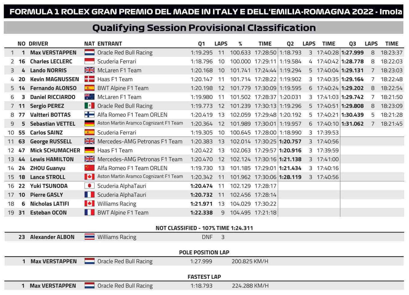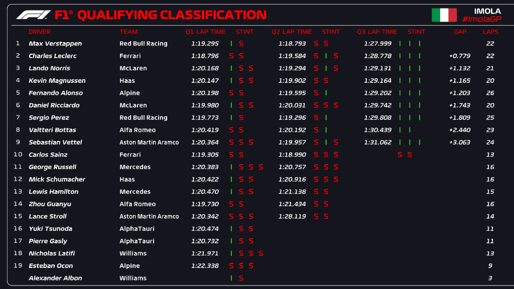 O Max Verstappen θα εκκινήσει το σπριντ του Σαββάτου στο GP Emilia Romagna από την πρώτη θέση, σημειώνοντας την πρώτη του φετινή pole position, λίγα χιλιόμετρα έξω από την έδρα της Ferrari. O συγχρονισμός της προτελευταίας από τις 5 κόκκινες σημαίες που διέκοψαν τη ροή των κατατακτήριων δοκιμών ευνόησε τον Ολλανδό, καθώς ο Charles Leclerc κατηγόρησε τον εαυτό του για την επιλογή να διατηρήσει τα ελαστικά του για τη δεύτερη προσπάθεια στο Q3, όταν η εγκατάλειψη του Valtteri Bottas προκάλεσε την κόκκινη σημαία. Η διακοπή αυτή άφησε μόλις 2 λεπτά και 58 δλ. στο χρονόμετρο για την ολοκλήρωση του Q3. Στο μεταξύ είχε αρχίσει να βρέχει ξανά και όταν τα μονοθέσια βγήκαν στην πίστα για τελευταία φορά, ο Lando Norris διέκοψε για τα καλά τη διαδικασία. Όπως πολλοί οδηγοί σήμερα, υπέπεσε στο λάθος να πατήσει στο kerb στην είσοδο της Acque Minerali.