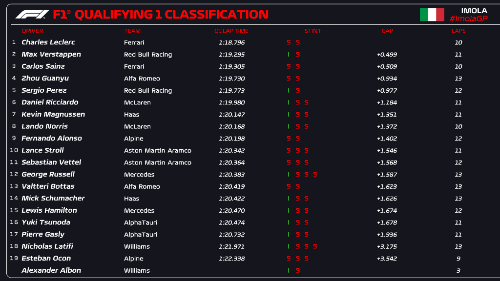 Εκτός δεκάδας είχε βρεθεί και ο Mick Schumacher, μεταξύ των δύο οδηγών της Mercedes, ο οποίος στο γύρο που θα μπορούσε να έχει βελτιώσει το χρόνο του, μπλόκαρε τα φρένα του και βγήκε εκτός πίστας στην Acque Minerali. Σε μια πολύ κακή ημέρα για την AlphaTauri, αμφότεροι οι οδηγοί αποκλείστηκαν από το πρώτο σκέλος της διαδικασίας. Παρά τις πολλαπλές αναβαθμίσεις που έφερε η ιταλική ομάδα, η απόδοση δεν ήταν καλή. Άτυχος ο Esteban Ocon, ο οποίος έπειτα από την πρώτη κόκκινη σημαία δεν κατάφερε να βγει ξανά στην πίστα, λόγω πιθανού προβλήματος στο κιβώτιο.