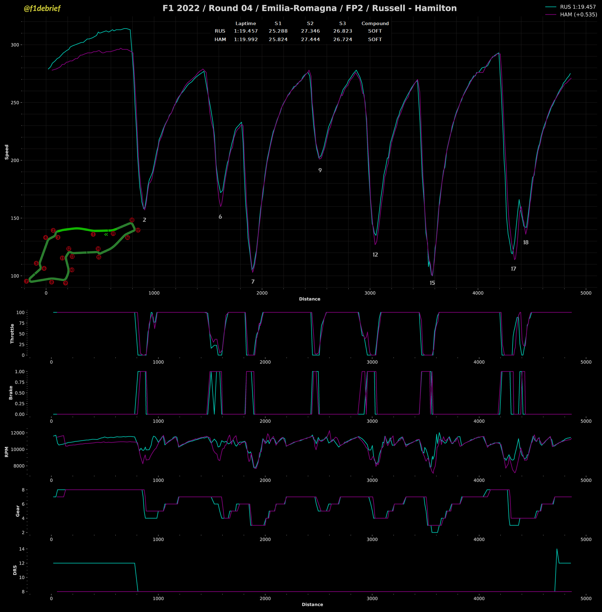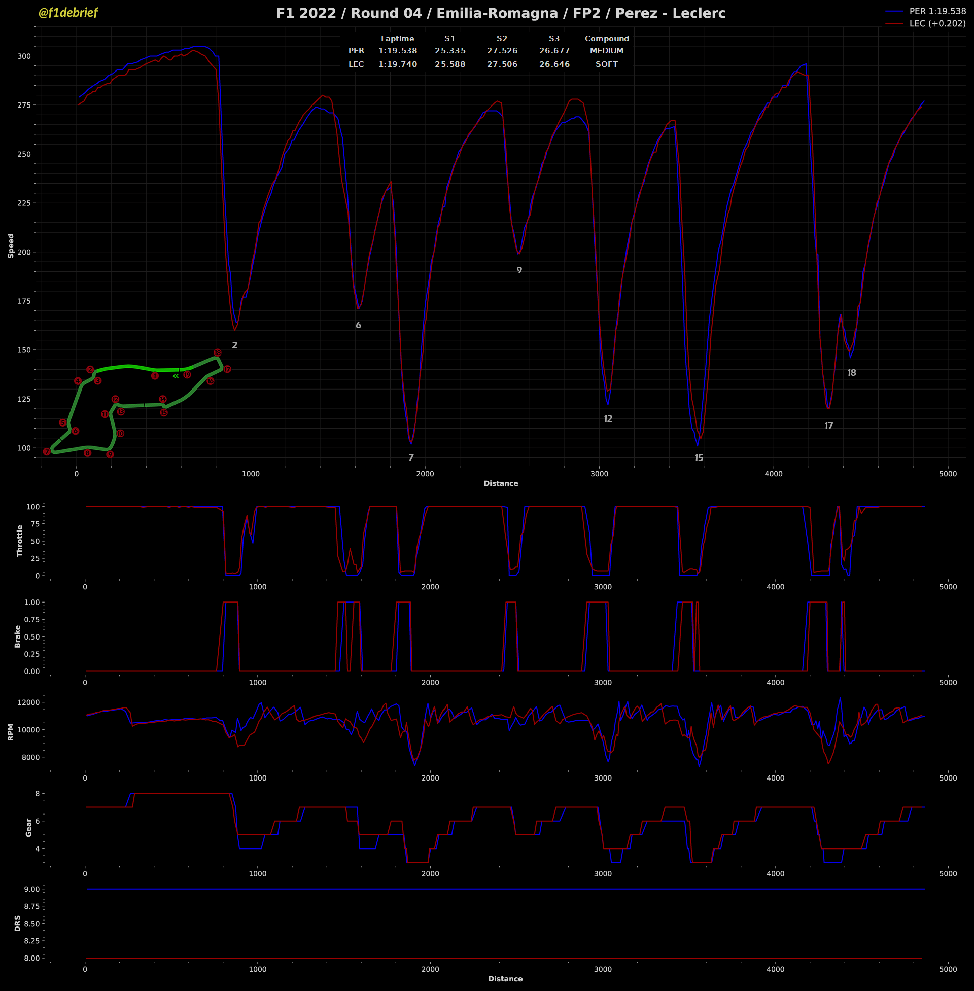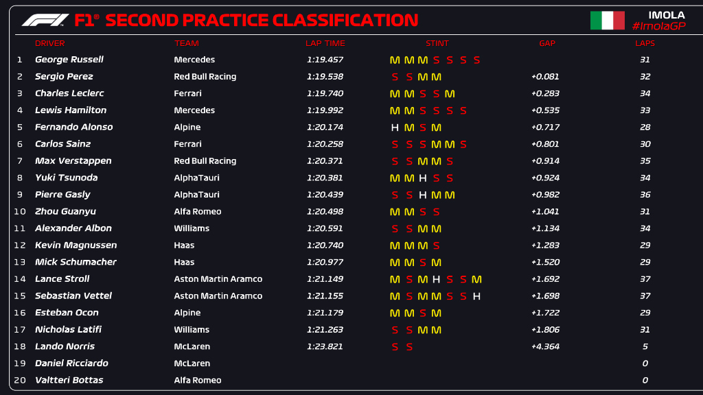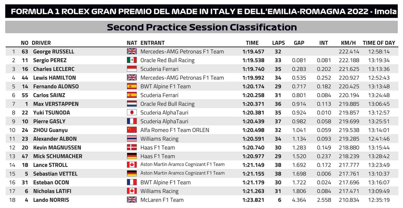 Ο Sergio Perez ήταν εξαιρετικά γρήγορος σήμερα, κυρίως με τη μέση γόμα στο δεύτερο μισό του FP2, αλλά και με τη μαλακή. Άλλωστε, με αυτήν εξασφάλισε τη δεύτερη θέση στον πίνακα των χρόνων. Ο Μεξικανός φάνηκε λίγο πιο προσαρμοσμένος στο στήσιμο της Red Bull στην Imola, όπου ήταν ταχύτατος και πέρυσι, τουλάχιστον στις κατατακτήριες δοκιμές και η RB18 φαινόταν να είναι “βιδωμένη” στη χλωρή πίστα, που μόλις είχε ξεκινήσει να στρώνεται με γόμα, έπειτα από τη βροχερή χθεσινή ημέρα.