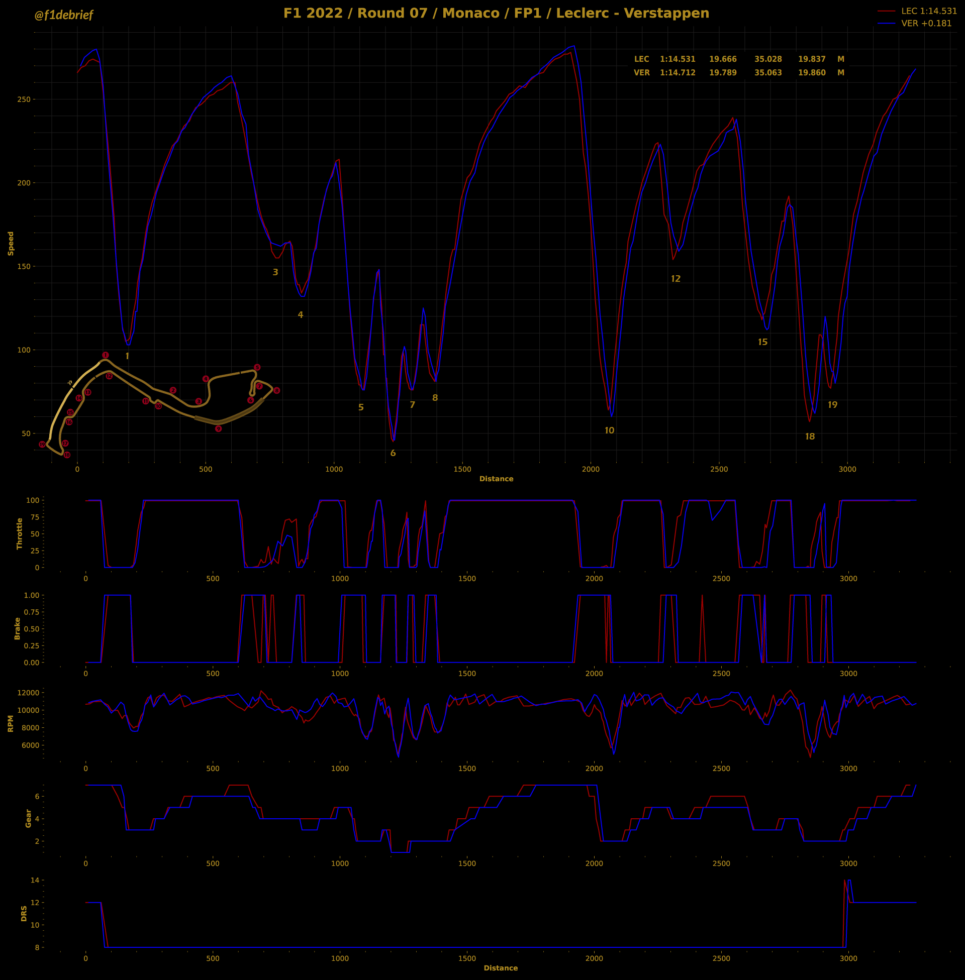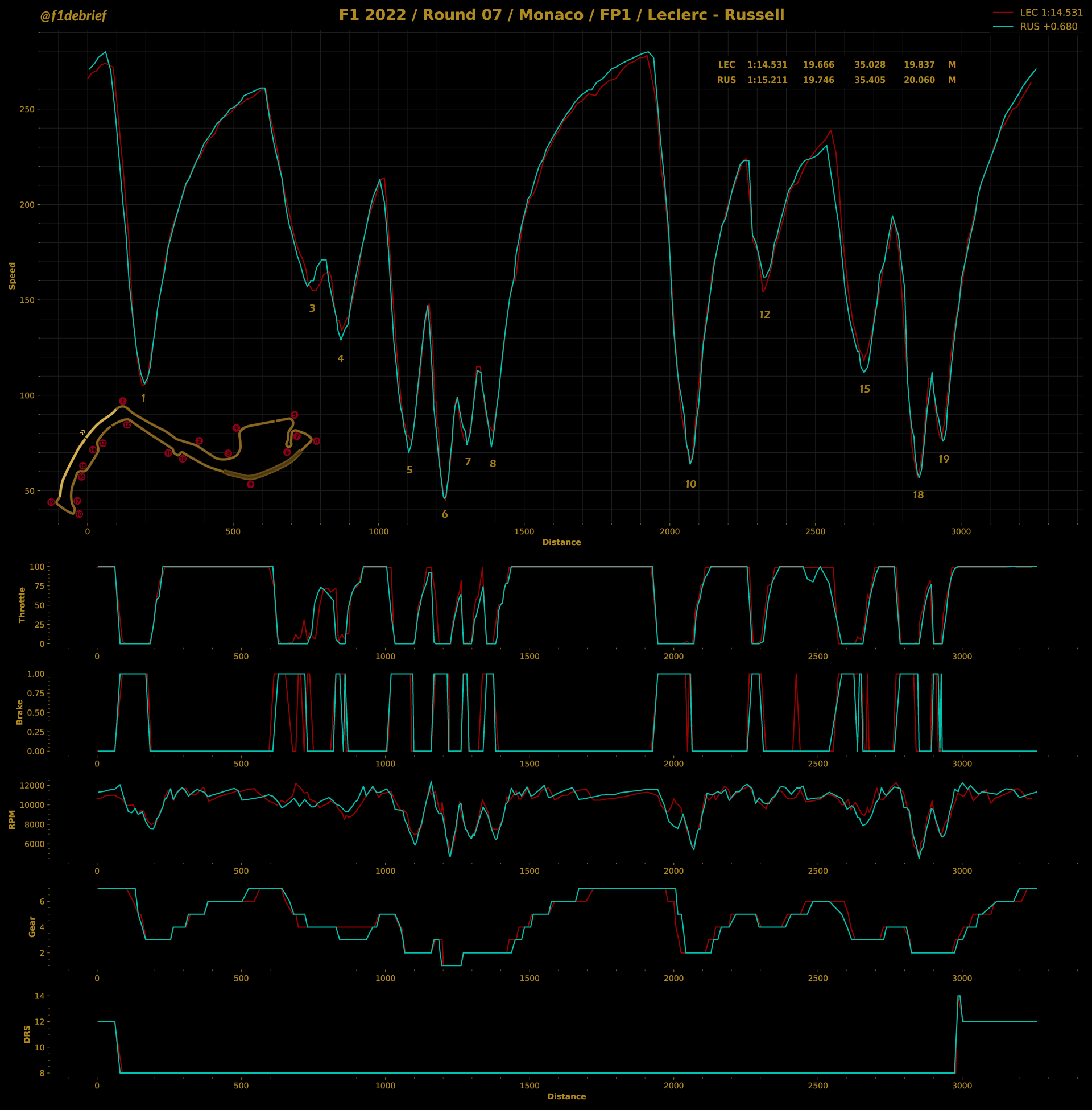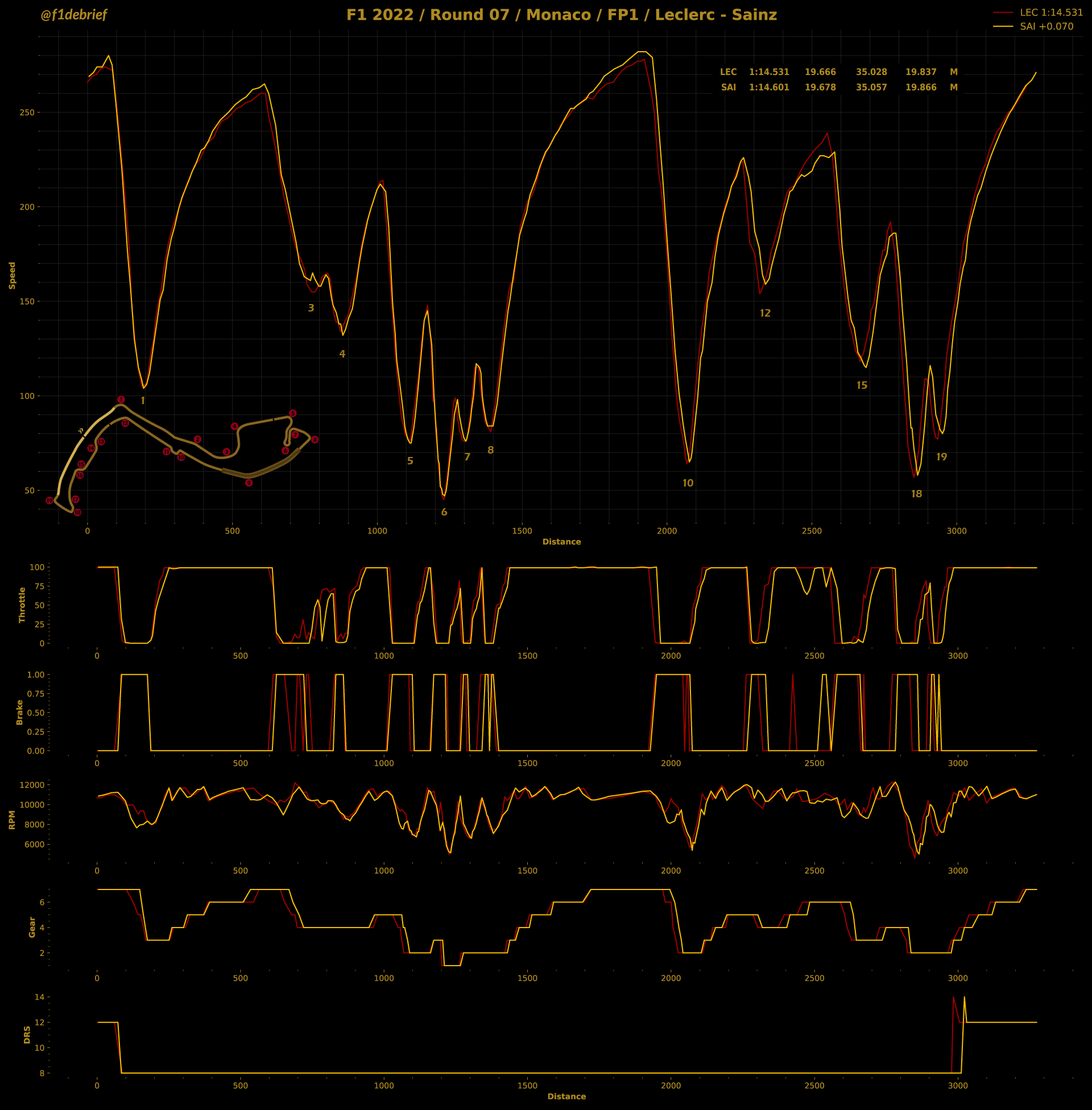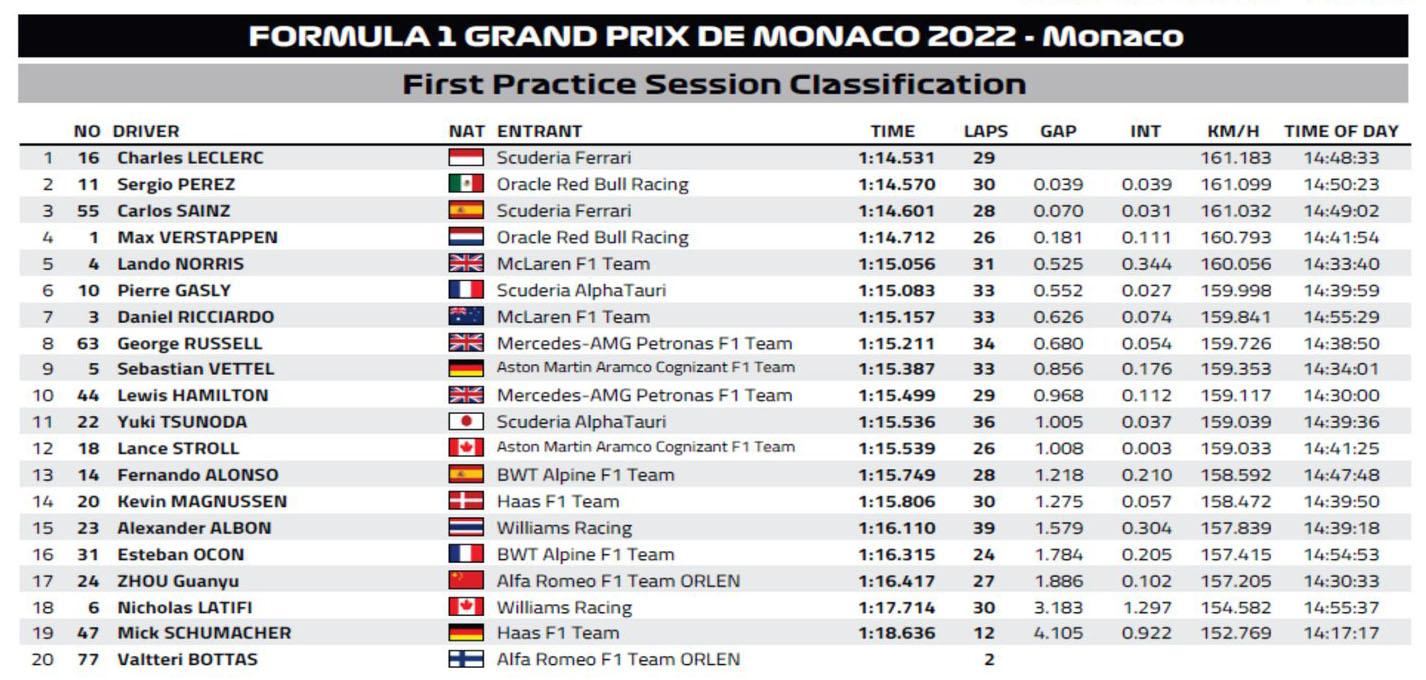 Αυτό προμηνύει ότι η μάχη για την επικράτηση στους δρόμους του πριγκιπάτου θα είναι συναρπαστική, καθώς φαίνεται ότι η διαφορά απόδοσης μεταξύ των δύο κορυφαίων μονοθεσίων είναι πολύ μικρή. Ο Charles Leclerc είχε διαφορά μόλις 39 χλστ. του δλ. από τον 2ο, Sergio Perez. Ο Carlos Sainz βρέθηκε στην 3η θέση 70 χλστ. του δλ. από τον επικεφαλής team-mate του, ενώ ο Max Verstappen σημείωσε τον 4ο χρόνο, όντας 181 χλστ. του δλ. πίσω από τον Μονεγάσκο.