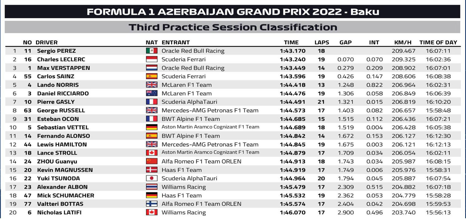 Σήμερα, ο αέρας δεν είχε τόσο μεγάλη ένταση στο Μπακού, ενώ η Pirelli αύξησε τις πιέσεις των ελαστικών του πίσω άξονα κατά 1 psi (22,5 πλέον, με 24,5 στον εμπρός). Οι συνθήκες που επικρατούσαν στο FP3 δεν ήταν αντιπροσωπευτικές και η πίστα είχε χάσει πρόσφυση σε σύγκριση με εχθές στο αρχικό κομμάτι της διαδικασίας.