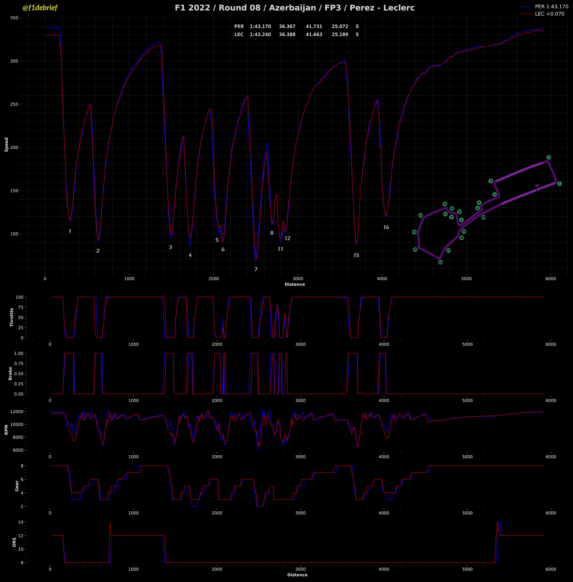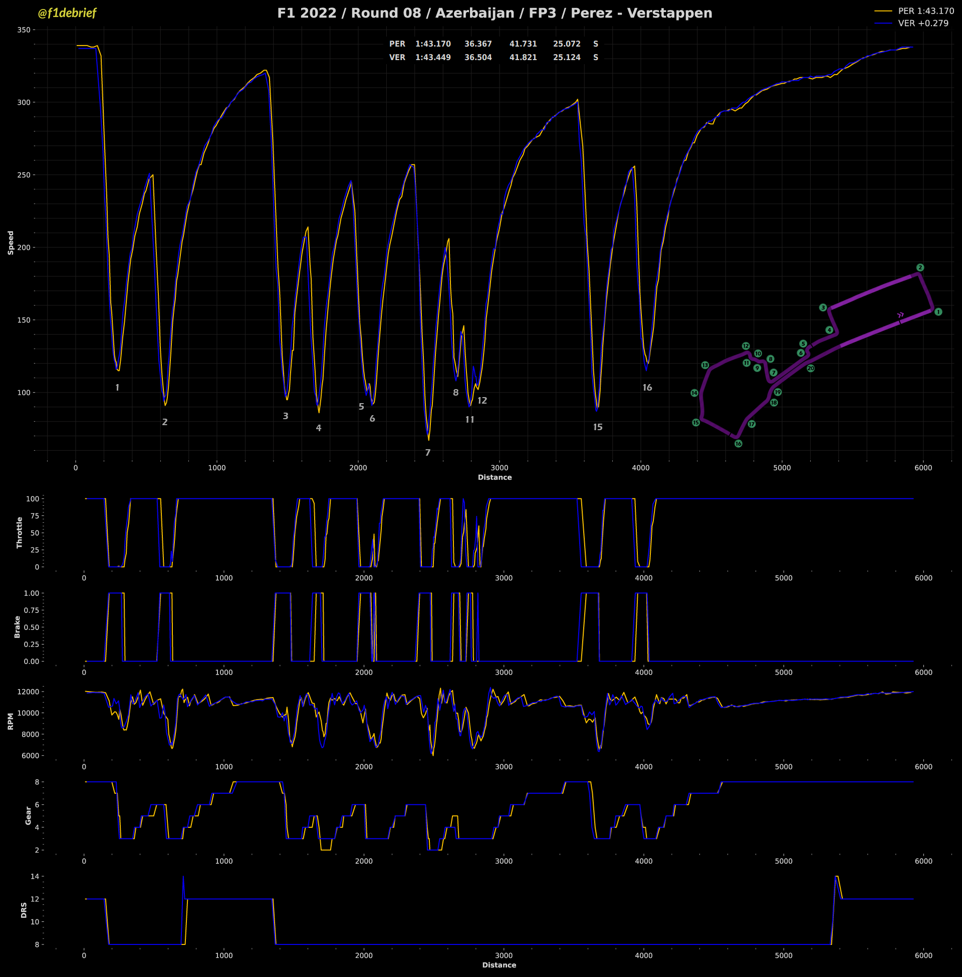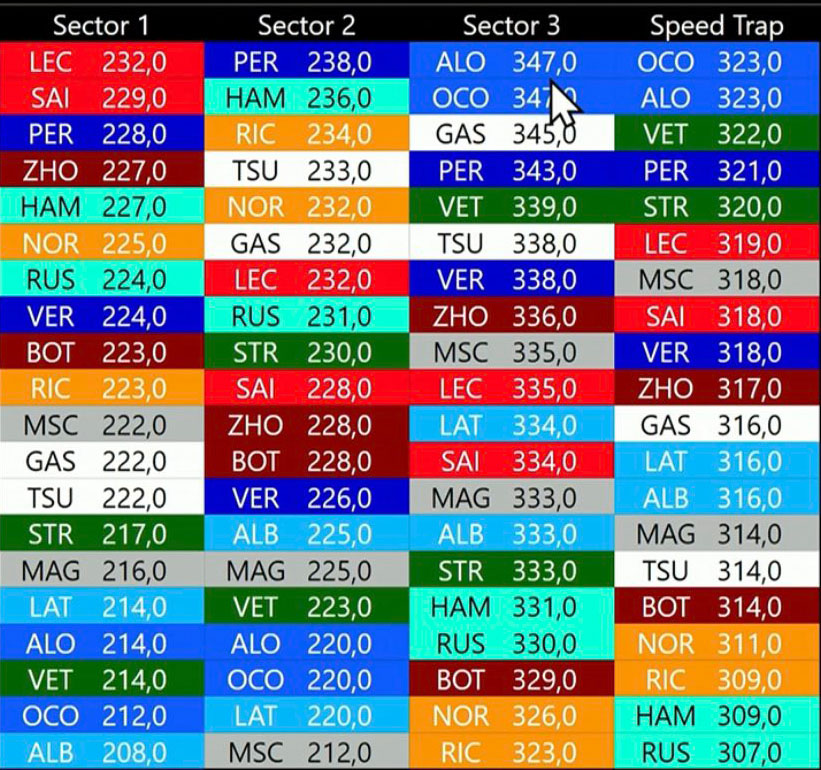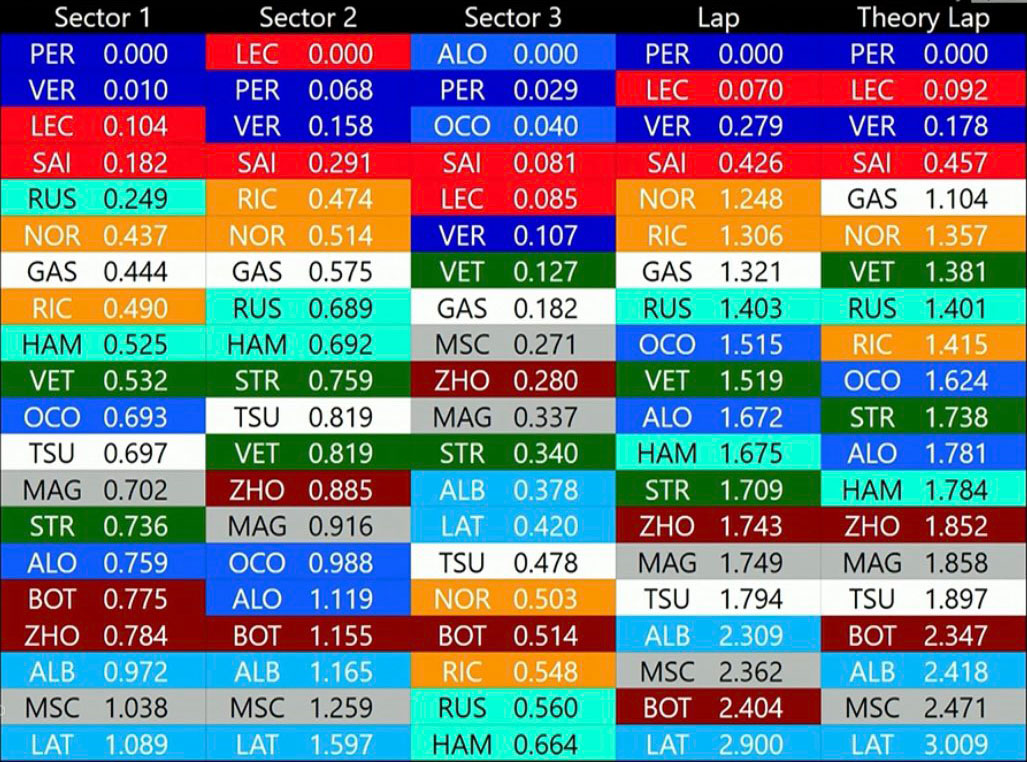Ωστόσο, κάποια πράγματα από εχθές εξακολουθούν να ισχύουν, όπως το γεγονός ότι ο Perez δείχνει πιο ανταγωνιστικός από τον team-mate του, Max Verstappen, ο οποίος ήταν και πάλι άτυχος, καθώς συνάντησε κίτρινες σημαίες (λόγω εξόδου του Bottas στη 2η στροφή) στον πρώτο του γρήγορο γύρο με τη μαλακή γόμα και τον εμπόδισε ο Alonso στη στροφή 9 στην τελική του προσπάθεια. Η Red Bull φαίνεται να βελτιώθηκε στο δεύτερο sector της πίστας, χωρίς να θυσιάσει τελική ταχύτητα.