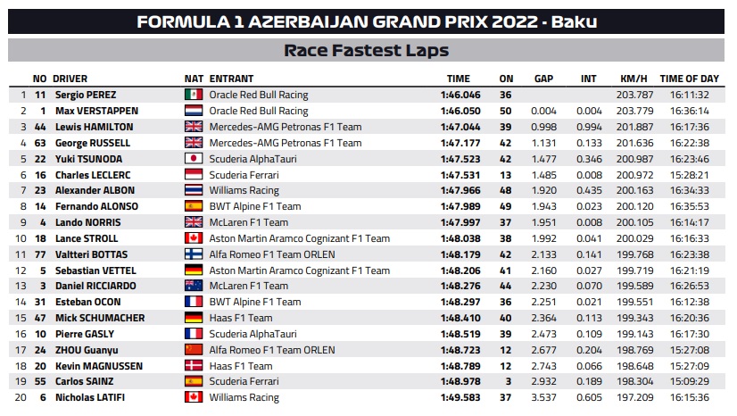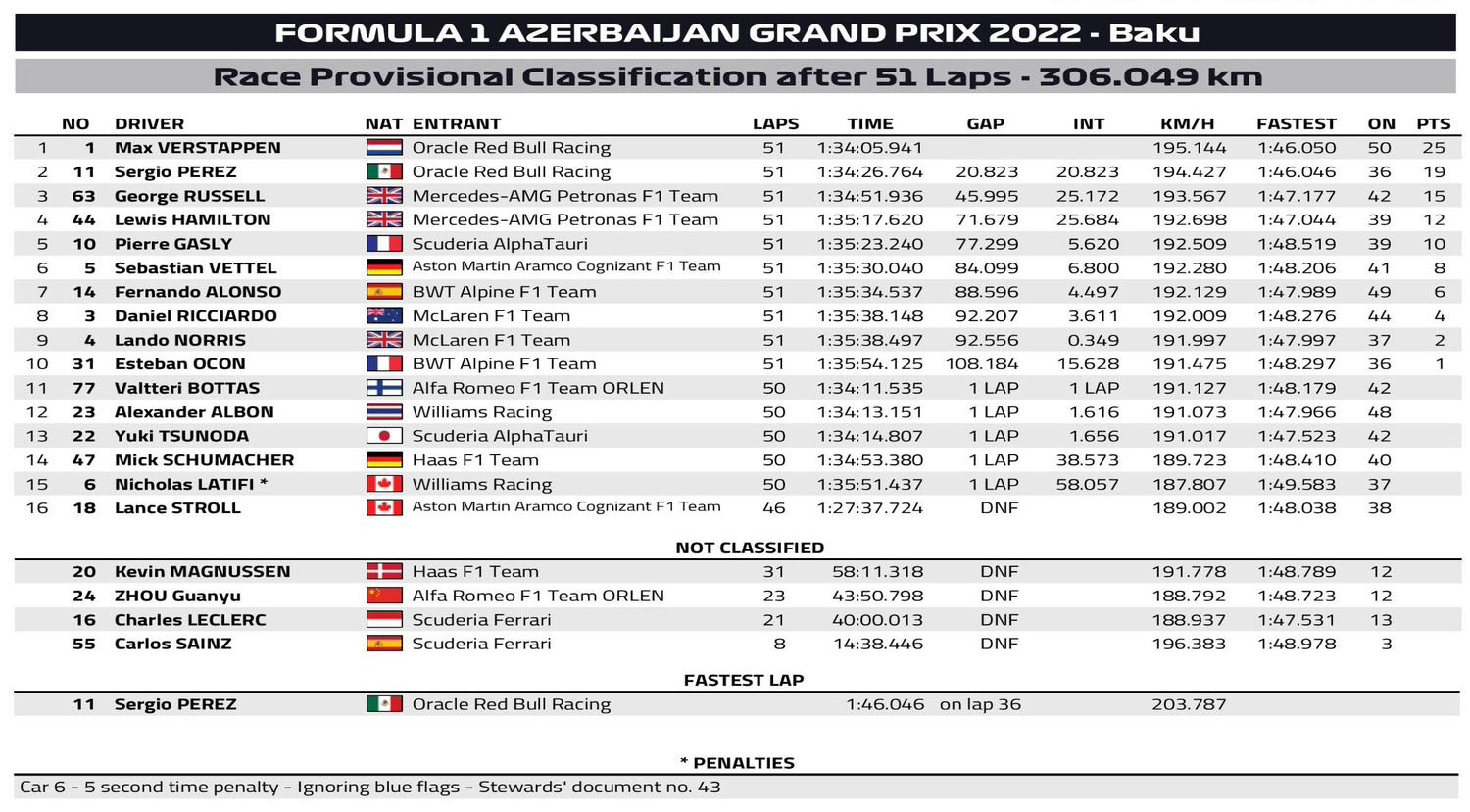 Ο Max Verstappen, με την 25η νίκη της καριέρας του (για να ισοφαρίσει τους Jim Clark και Niki Lauda), ίσως επιβεβαίωσε τα σχόλια του αγωνιστικού συμβούλου της Red Bull, Helmut Marko, ότι δεν πρόκειται να υπάρξει μάχη μεταξύ των οδηγών της για τον τίτλο, επειδή ο Ολλανδός θα επικρατήσει, καθώς είναι ταχύτερος. Στο Μπακού, φάνηκε να έχει προετοιμάσει το μονοθέσιό του καλύτερα για την καταπόνηση ελαστικών που προέκυψε στις υψηλές θερμοκρασίες.