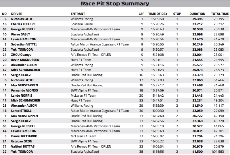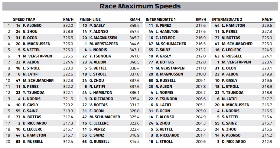Η στρατηγική της AlphaTauri για τον Gasly ήταν ριψοκίνδυνη, της Mercedes όμως ήταν η σωστή και ο Hamilton πέρασε μπροστά από τον Γάλλο. O Gasly είχε επικρατήσει νωρίτερα στη μάχη του με τον Daniel Ricciardo, ενώ ο Vettel δεν κατάφερε να πλησιάσει την AlphaTauri στο τέλος του αγώνα. Πίσω από τον Γερμανό τερμάτισε ο Alonso, εκμεταλλευόμενος την υψηλή τελική ταχύτητα της Alpine για να διατηρήσει πίσω του τις McLaren. Ωστόσο, η γαλλική ομάδα πλήρωσε το τίμημα όσον αφορά την καταπόνηση ελαστικών, καθώς η Alpine ολίσθαινε συνεχώς στις αργές στροφές.