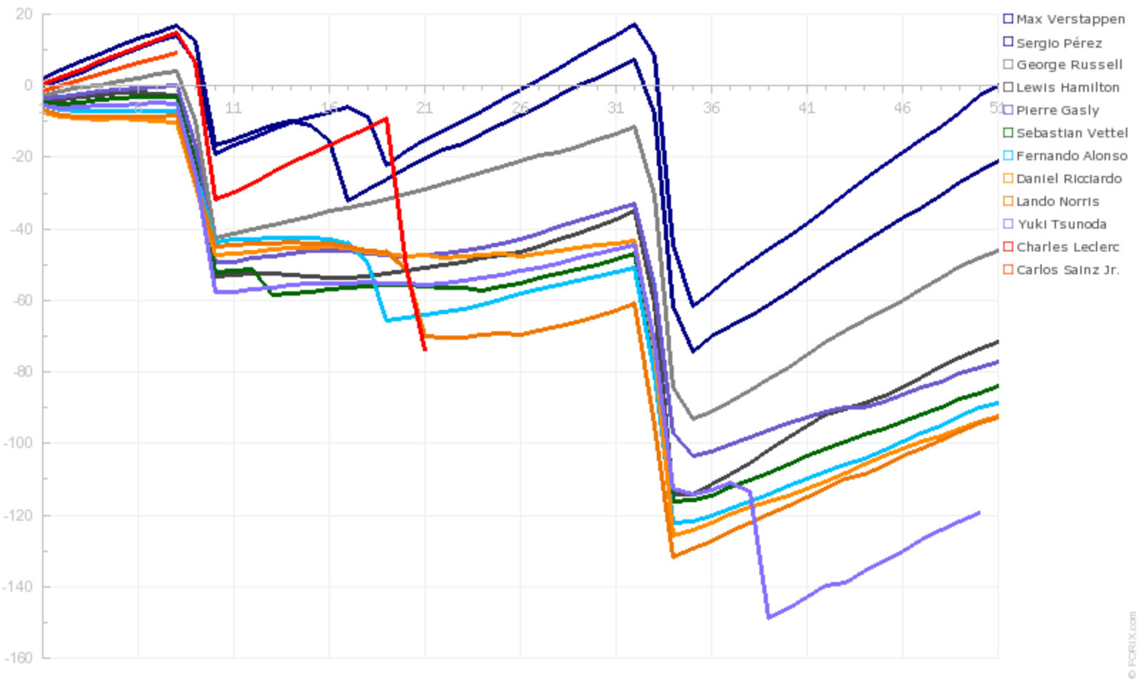 Παρά τις δηλώσεις του Binotto, ο τόνος της φωνής του Leclerc εκδήλωνε την απογοήτευσή του, καθώς αντιλαμβάνεται ότι πλέον η διεκδίκηση του τίτλου έχει αρχίσει να απομακρύνεται επικίνδυνα, έπειτα από τη δεύτερη εγκατάλειψή του σε 3 Grand Prix. Σε ρυθμό αγώνα, η Ferrari υστερούσε σε σύγκριση με τη Red Bull. Έχοντας ίσως αναγνωρίσει το γεγονός αυτό, η ιταλική ομάδα είχε ρισκάρει με τη στρατηγική του Leclerc, για να τον φέρει στα pits με το πρώτο εικονικό αυτοκίνητο ασφαλείας, που προκάλεσε η εγκατάλειψη του… Sainz. Δεδομένου ότι υπήρξε και δεύτερο VSC στον 34ο γύρο που θα επέτρεπε στη Ferrari να κάνει άλλο ένα pit stop με μικρότερη απώλεια χρόνου, ίσως η στρατηγική αυτή να απέδιδε, παρότι το pit stop του Μονεγάσκου ήταν χρονοβόρο, καθώς δυσλειτούργησε ο εμπρός γρύλος.