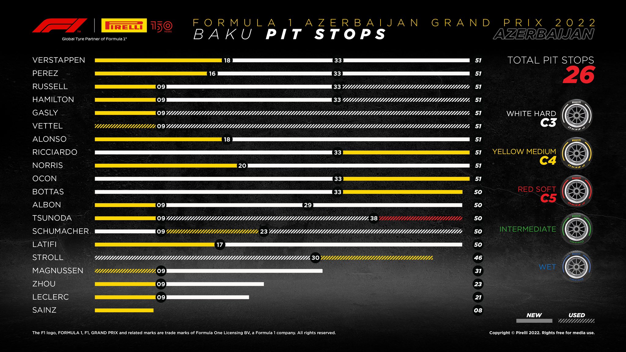 Ο Max Verstappen έγινε ο 6ος διαφορετικός νικητής στα 6 Grand Prix που έχουν διεξαχθεί στο Μπακού, καθώς έκανε άψογη διαχείριση των ελαστικών του, ιδίως με τη μέση γόμα στο πρώτο stint. Αυτό ήταν το στοιχείο το οποίο κόστισε τη νίκη στον έτερο οδηγό της Red Bull, Sergio Perez, ο οποίος είχε τεθεί επικεφαλής στην πρώτη στροφή του αγώνα. O Μεξικανός όμως ταλαιπώρησε πολύ τα ελαστικά του στο πρώτο κομμάτι του αγώνα, γεγονός που επέτρεψε στον Verstappen να τον προσπεράσει εύκολα.