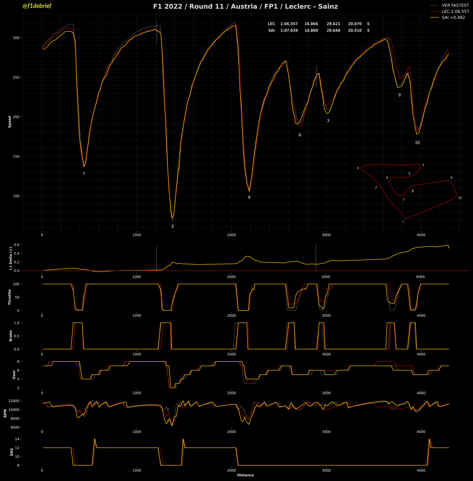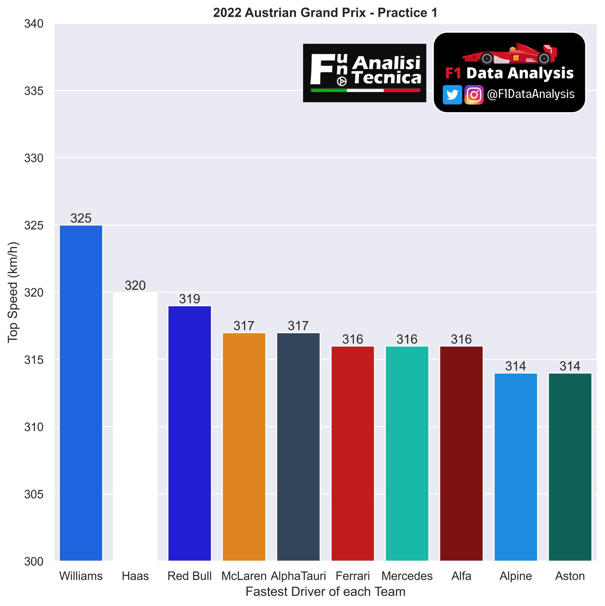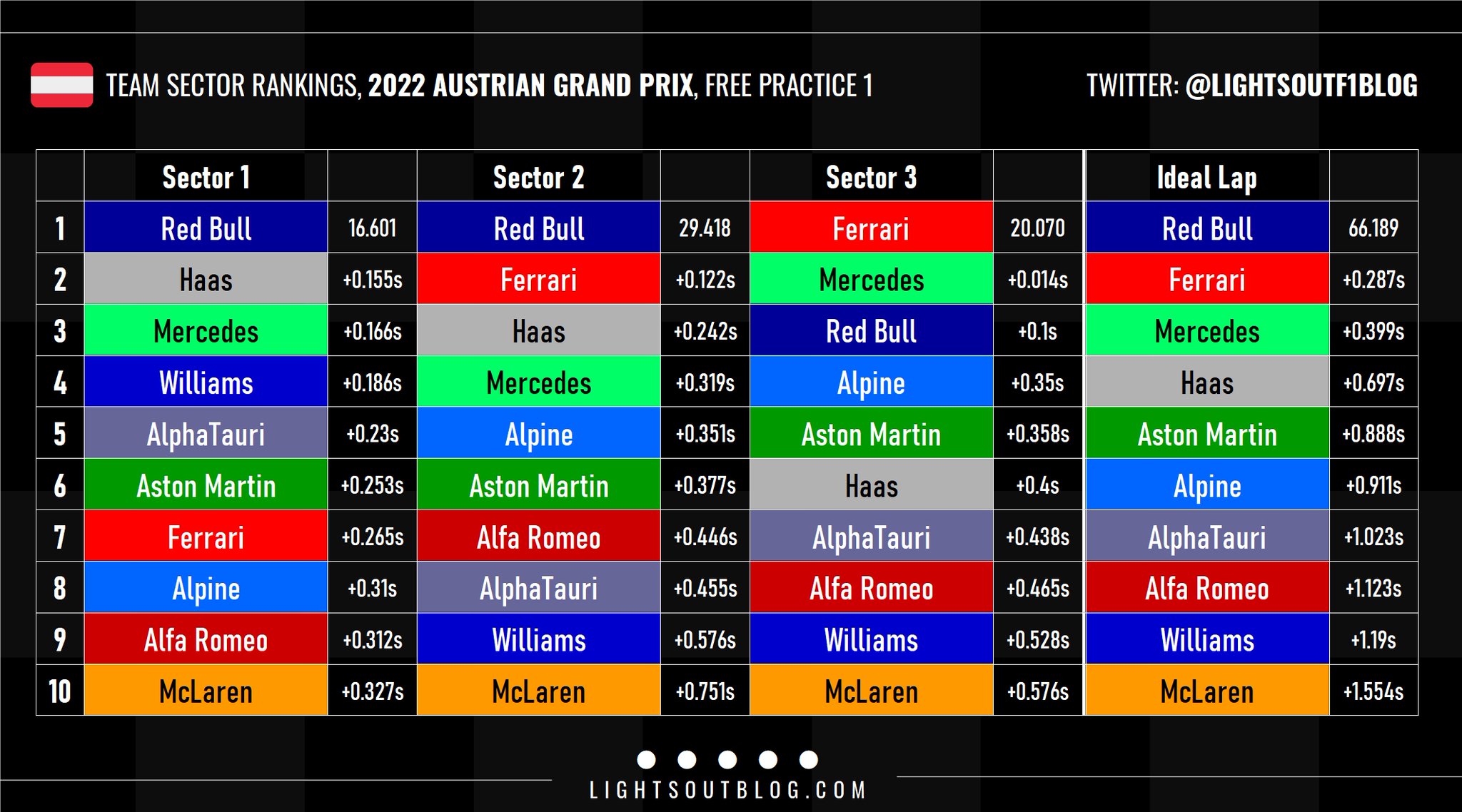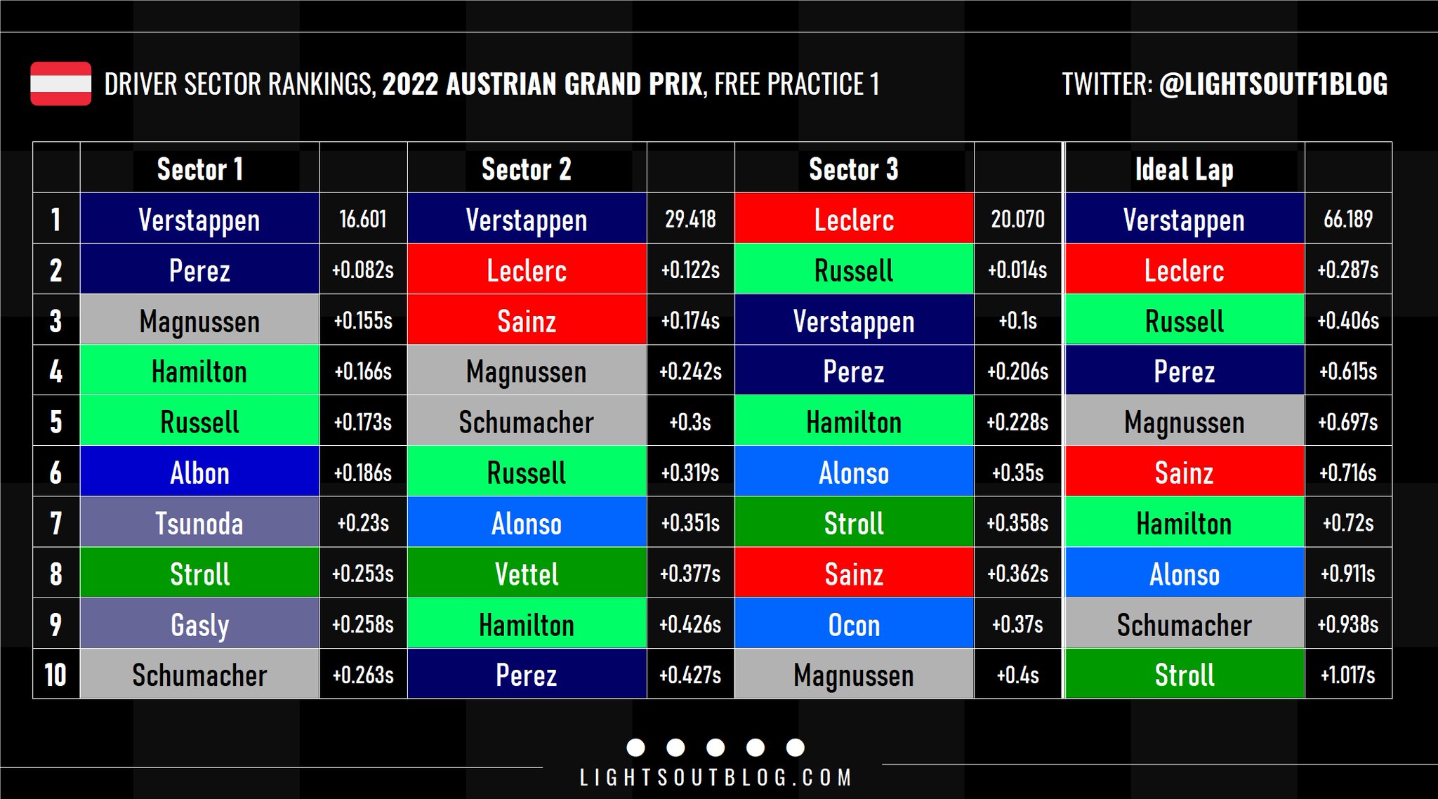 Ο Max Verstappen σημείωσε τον ταχύτερο χρόνο του FP1 για το GP Αυστρίας, με διαφορά 0,25 δλ. από τον 2ο, Charles Leclerc, ο οποίος βελτίωσε την επίδοσή του κατά 1 δέκατο του δλ. στα τελευταία λεπτά της διαδικασίας, σημειώνοντας πολύ γρήγορο χρόνο στο τελευταίο sector. Στην 3η θέση βρέθηκε ο George Russell με την Mercedes, ενώ ο Sergio Perez κατετάγη 4ος με έναν γρήγορο γύρο στις τελευταίες στιγμές της διαδικασίας.