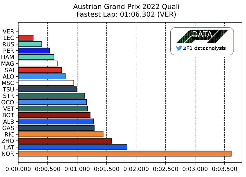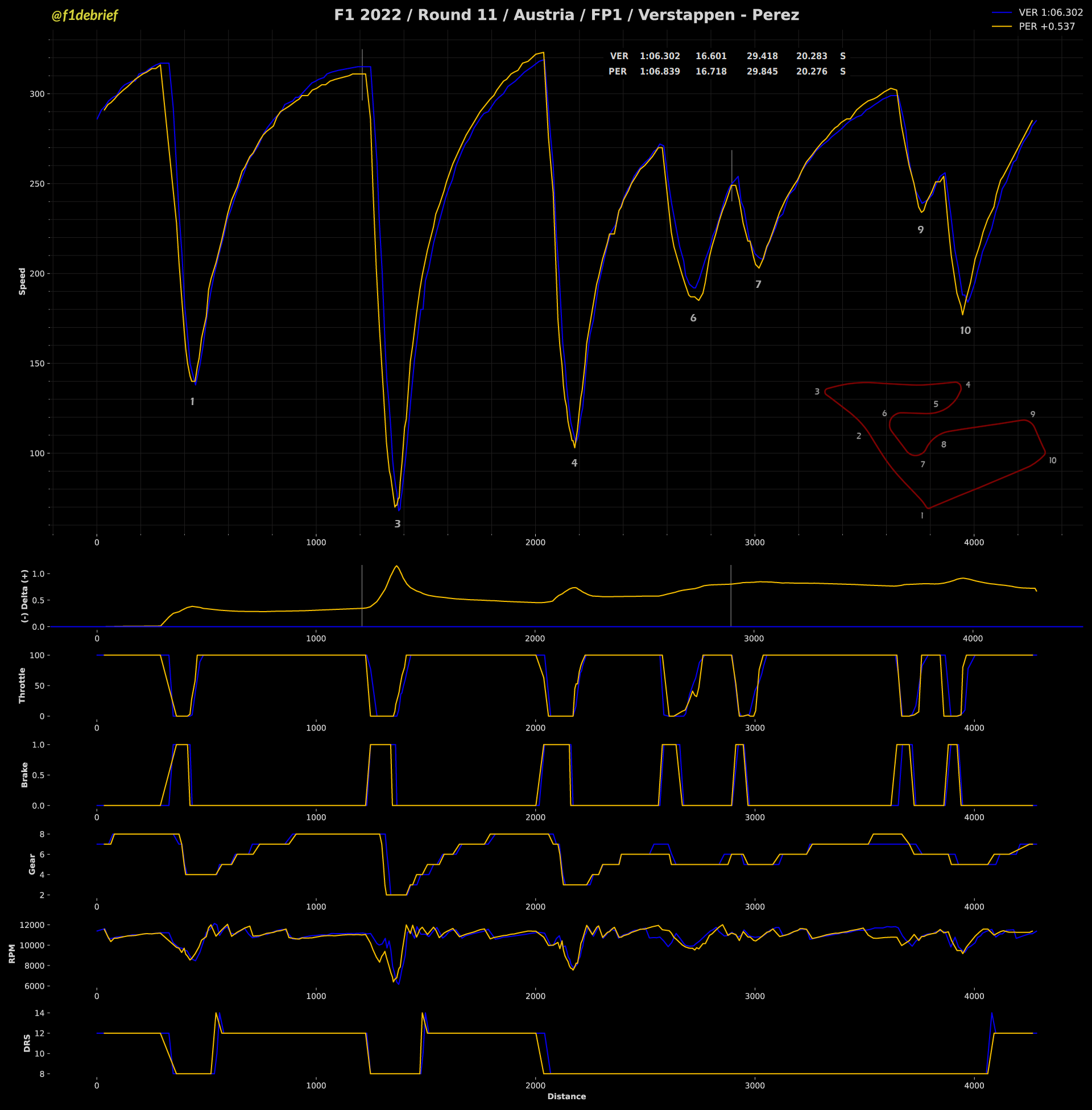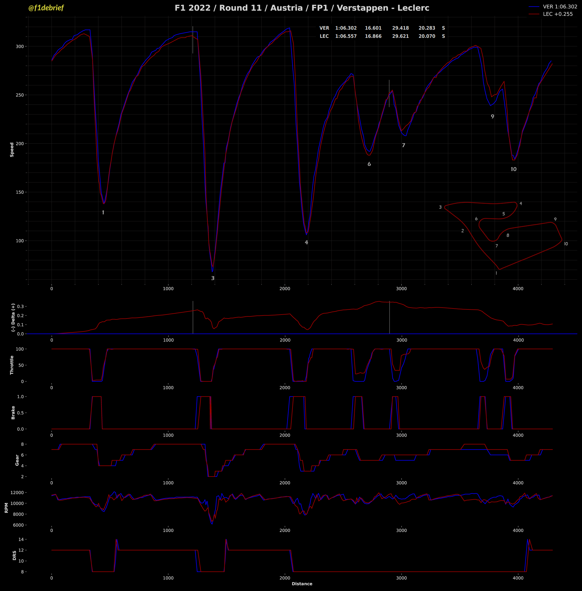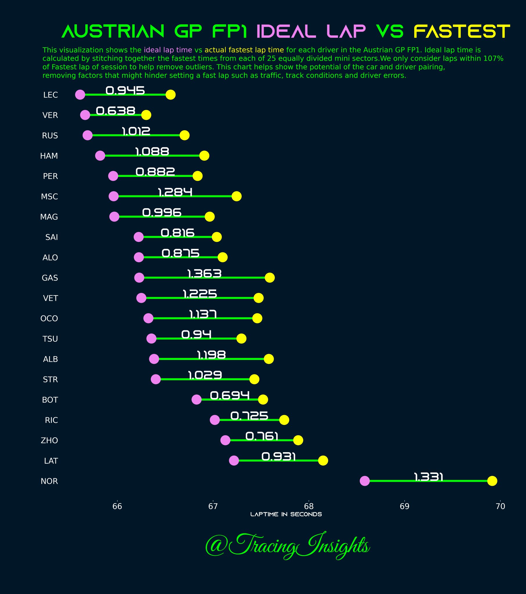Ο Max Verstappen σημείωσε τον ταχύτερο χρόνο του FP1 για το GP Αυστρίας, με διαφορά 0,25 δλ. από τον 2ο, Charles Leclerc, ο οποίος βελτίωσε την επίδοσή του κατά 1 δέκατο του δλ. στα τελευταία λεπτά της διαδικασίας, σημειώνοντας πολύ γρήγορο χρόνο στο τελευταίο sector. Στην 3η θέση βρέθηκε ο George Russell με την Mercedes, ενώ ο Sergio Perez κατετάγη 4ος με έναν γρήγορο γύρο στις τελευταίες στιγμές της διαδικασίας.