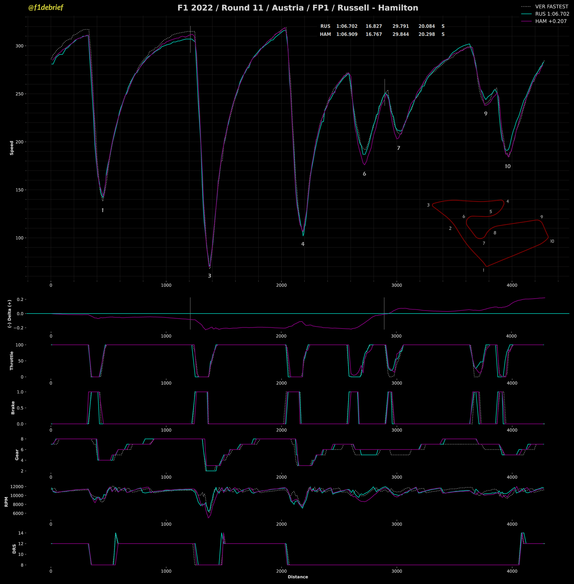 Ο διευθυντής της Mercedes, Toto Wolff δήλωσε ότι υπήρχαν μερικές λύσεις στο μονοθέσιο του Russell που πιθανότατα θα υιοθετηθούν και σε αυτό του Hamilton. Η γερμανική ομάδα δεν φαίνεται να αντιμετωπίζει προβλήματα αναπηδήσεων στο Red Bull Ring. Σε πολύ καλή θέση βρέθηκε ο Kevin Magnussen, ο οποίος σημείωσε τον 6ο ταχύτερο χρόνο, για να βρεθεί εμπρός από τη Ferrari του Carlos Sainz. Πίσω από τον συμπατριώτη του, ο Fernando Alonso κατετάγη 8ος με τη μέση γόμα, καθώς οι Alpine και οι McLaren δεν χρησιμοποίησαν τη μαλακή. Την πρώτη δεκάδα συμπλήρωσαν ο Mick Schumacher με την άλλη Haas και ο Yuki Tsunoda με την AlphaTauri.