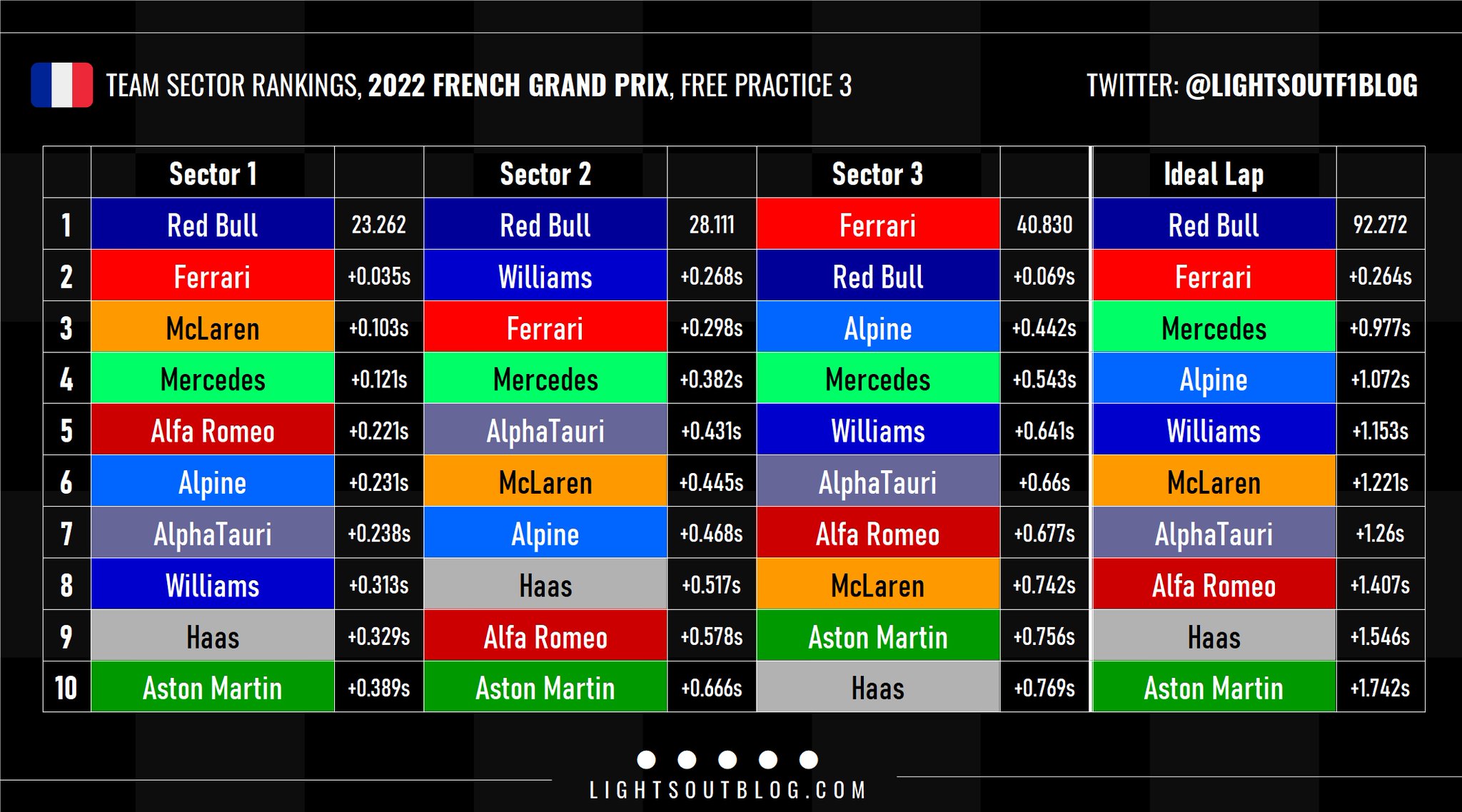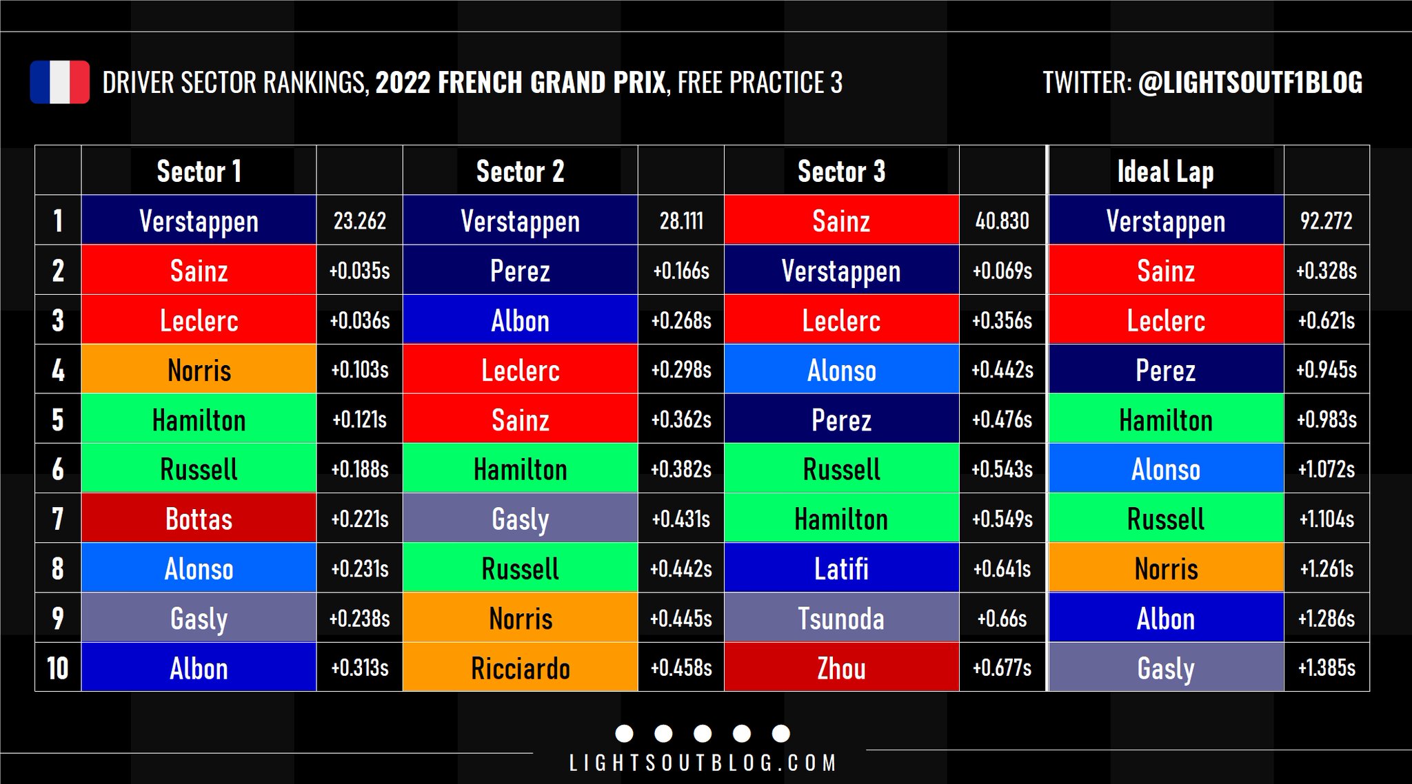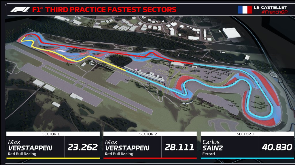Ο Max Verstappen σημείωσε τον ταχύτερο χρόνο του FP3 για το GP Γαλλίας, με μεγάλη διαφορά (0,35 δλ.) από τον 2ο, Carlos Sainz. Όπως έχουμε δει στους τελευταίους αγώνες, είναι πολύ πιθανό η Ferrari να έχει επιλέξει συντηρητικές ρυθμίσεις μονάδας ισχύος για τη συγκεκριμένη διαδικασία, προσπαθώντας να προστατεύσει όσο μπορεί τους εύθραυστους κινητήρες της.