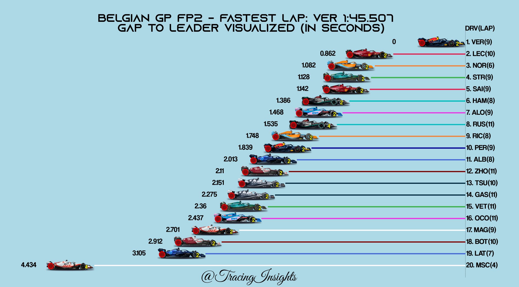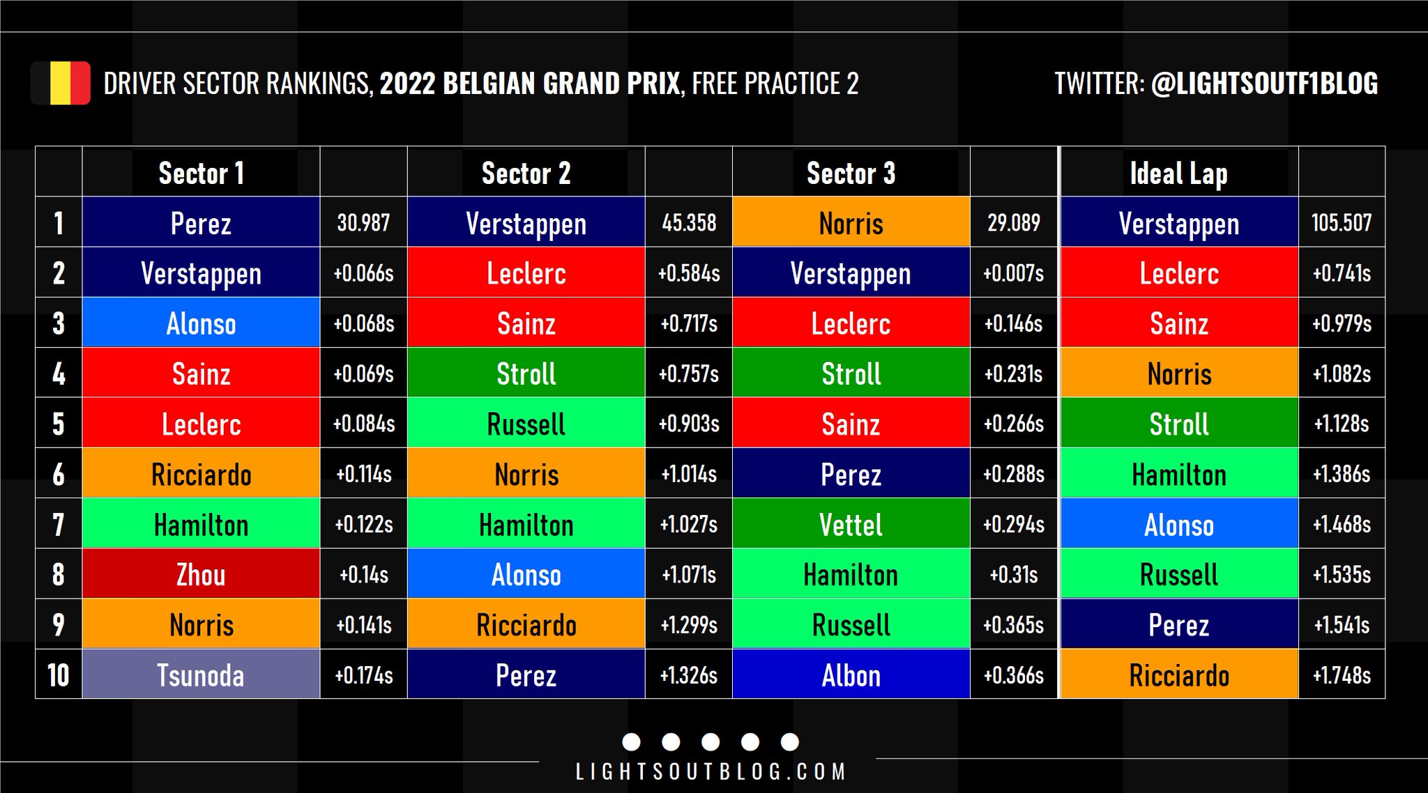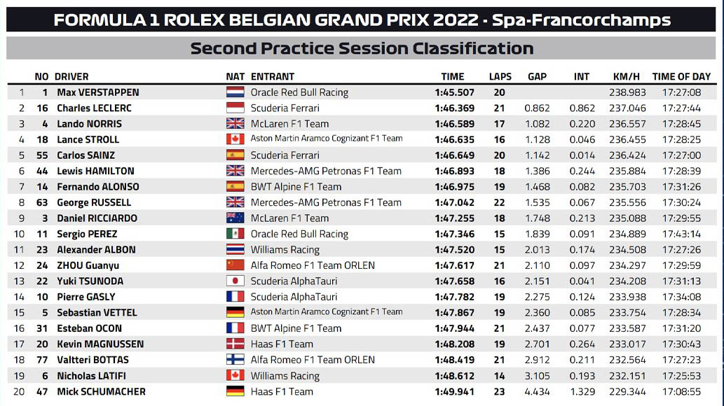 Οι δύο οδηγοί που έχουν ήδη πάρει ποινές στη σειρά εκκίνησης του αγώνα της Κυριακής, οι Max Verstappen και Charles Leclerc ήταν οι ταχύτεροι οδηγοί του FP2 για το GP Βελγίου. Ωστόσο, η διαφορά μεταξύ τους ήταν πολύ μεγάλη, αν και ενδέχεται ο Leclerc να έκανε λάθος στις στροφές 5-6-7 στη γρήγορη προσπάθειά του, καθώς όταν ενημερώθηκε για τη διαφορά από τον Ολλανδό αντίπαλό του, κατέδειξε αυτές τις στροφές στον ασύρματο.