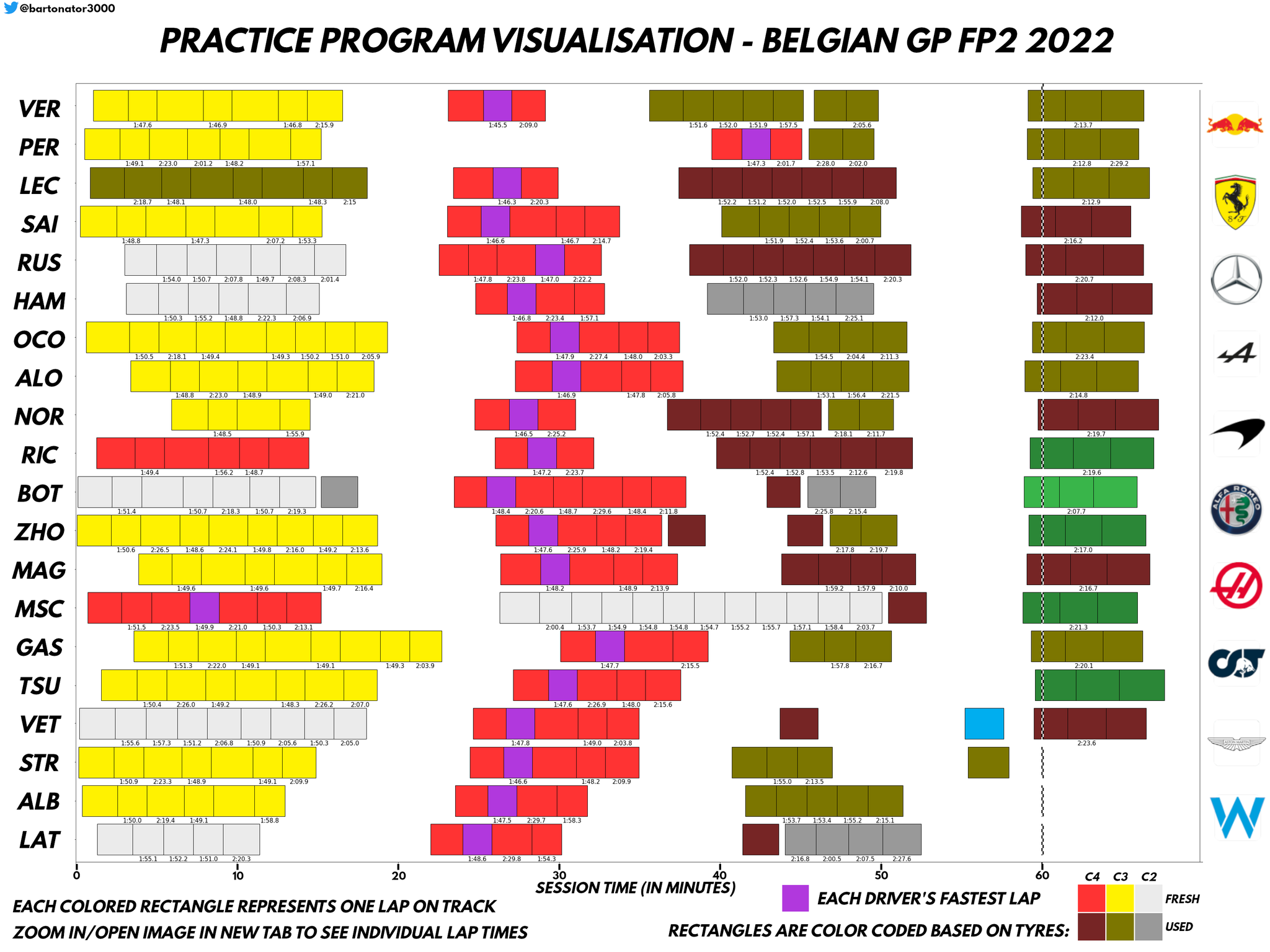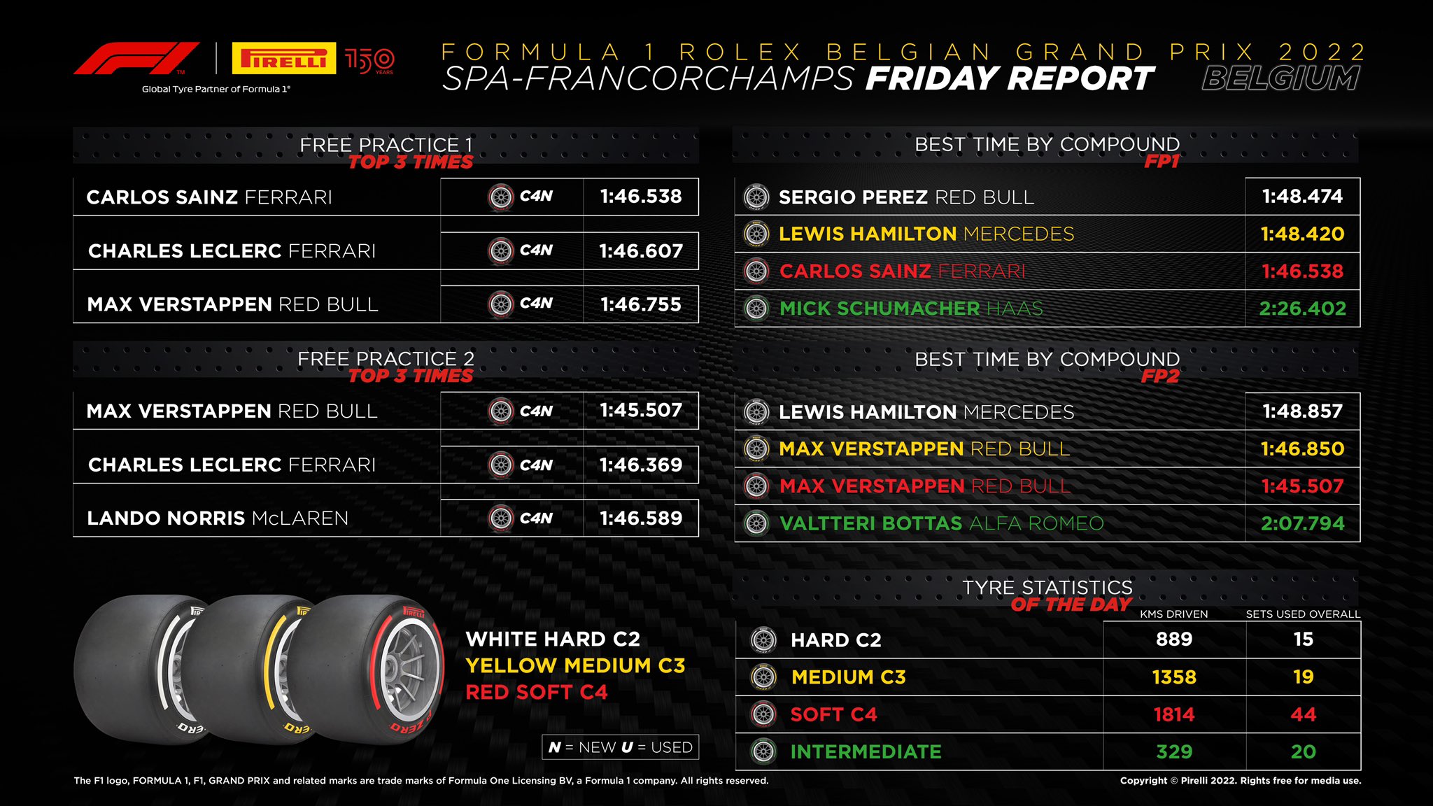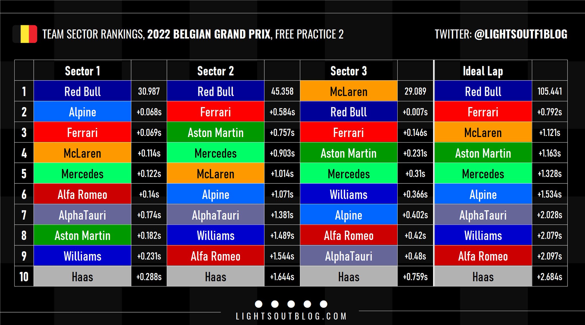 Οι δύο οδηγοί που έχουν ήδη πάρει ποινές στη σειρά εκκίνησης του αγώνα της Κυριακής, οι Max Verstappen και Charles Leclerc ήταν οι ταχύτεροι οδηγοί του FP2 για το GP Βελγίου. Ωστόσο, η διαφορά μεταξύ τους ήταν πολύ μεγάλη, αν και ενδέχεται ο Leclerc να έκανε λάθος στις στροφές 5-6-7 στη γρήγορη προσπάθειά του, καθώς όταν ενημερώθηκε για τη διαφορά από τον Ολλανδό αντίπαλό του, κατέδειξε αυτές τις στροφές στον ασύρματο.