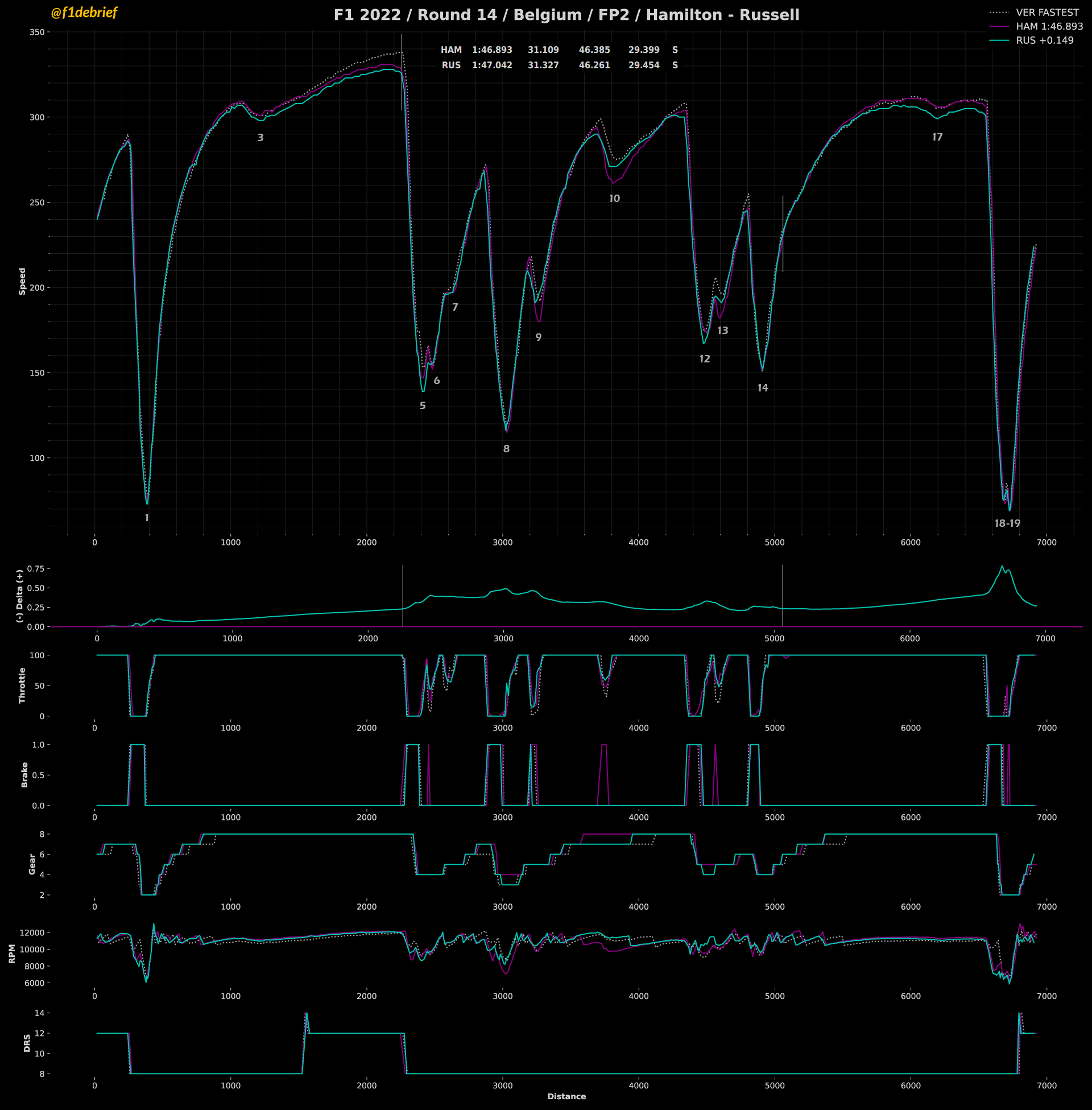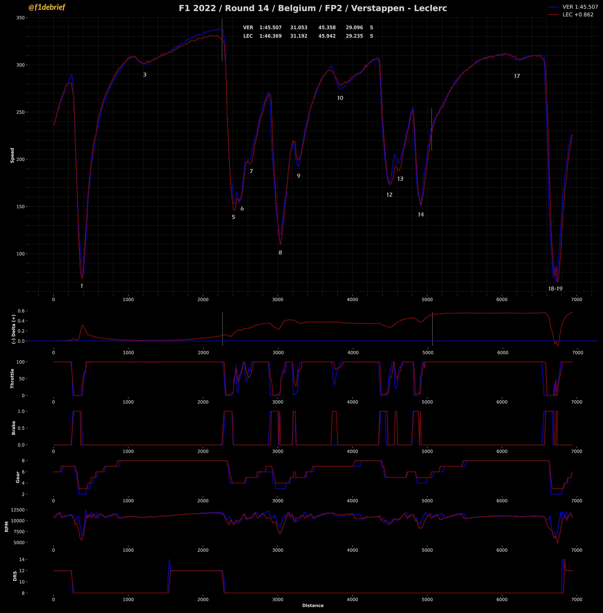 Η Ferrari βελτίωσε την τελική ταχύτητα της F1-75, με τον Leclerc να φτάνει τα 334 χλμ./ώρα, 4 χλμ./ώρα πίσω από τον Verstappen και 10 χλμ./ώρα πίσω από τον Sergio Perez. Στη σύγκριση των sector, το μεγαλύτερο κέρδος (0,6 δλ.) ο Verstappen κατάφερε να το κερδίσει στο μεσαίο τμήμα της πίστας, το οποίο περιέχει την πλειονότητα των γρήγορων στροφών. Η Red Bull έχει τη δυνατότητα να αναπτύξει πολύ υψηλές τελικές ταχύτητες στις ευθείες, χωρίς να χάνει απόδοση στις στροφές.