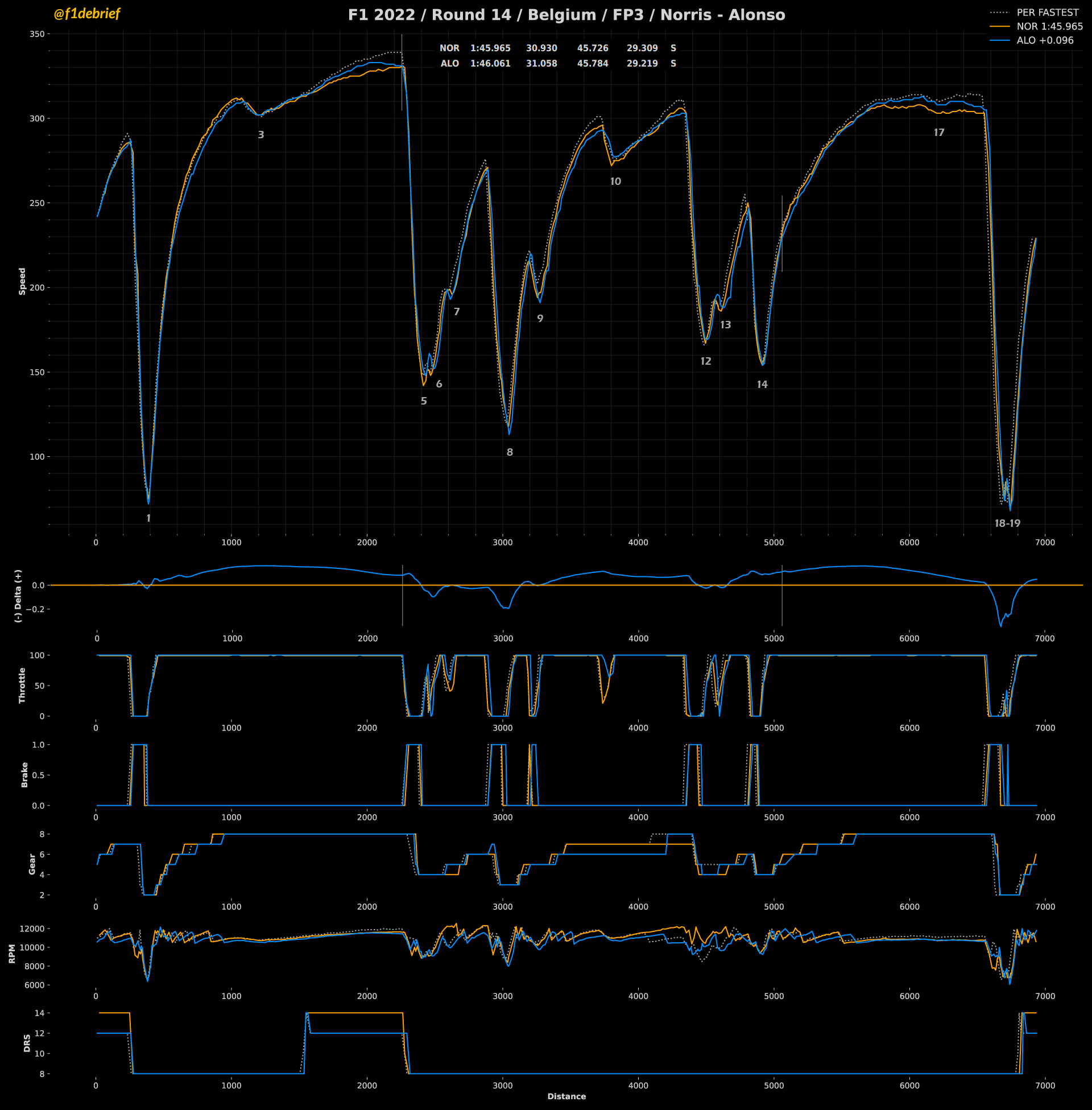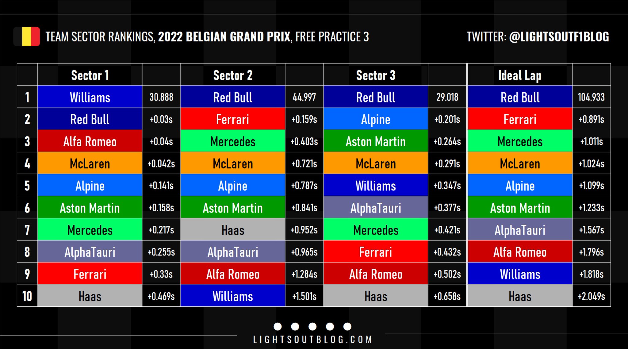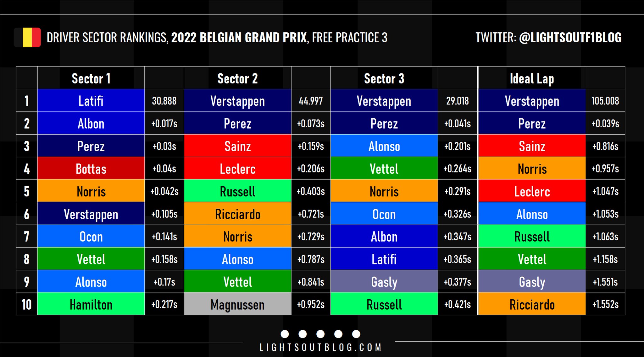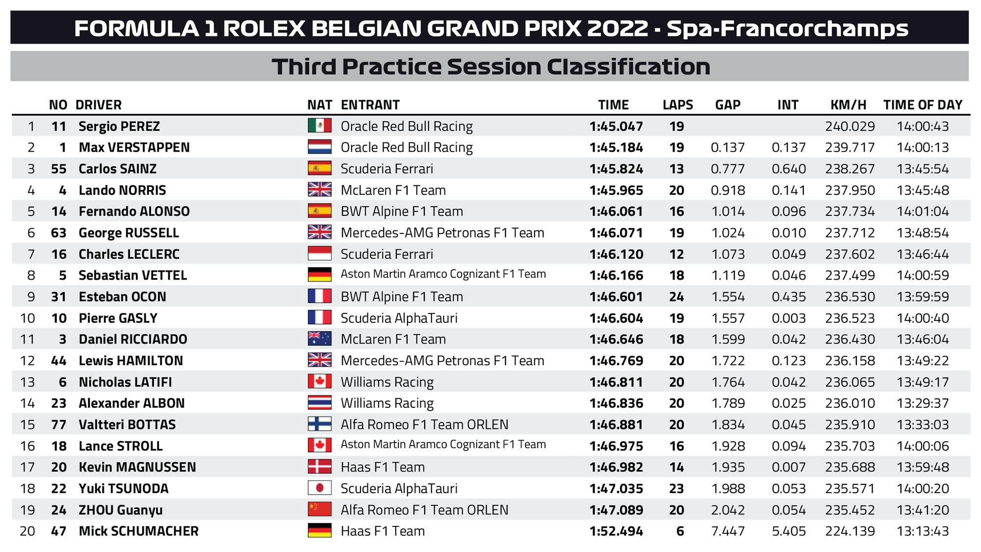 Πολύ καλό χρόνο σημείωσαν οι Lando Norris (McLaren) και Fernando Alonso (Alpine), για να καταταγούν στην 4η και 5η θέση, αντίστοιχα, με τον Ισπανό να σημειώνει την υψηλότερη τελική ταχύτητα της διαδικασίας (340 χλμ./ώρα). Ο George Russell βρέθηκε στην 6η θέση, ενώ ο team-mate του στη Mercedes, Lewis Hamilton, που φαίνεται να δυσκολεύεται περισσότερο με τη συμπεριφορά της W13 στο Spa, κατέληξε στη 12η θέση, έχοντας εγκαταλείψει την τελική του γρήγορη προσπάθεια.