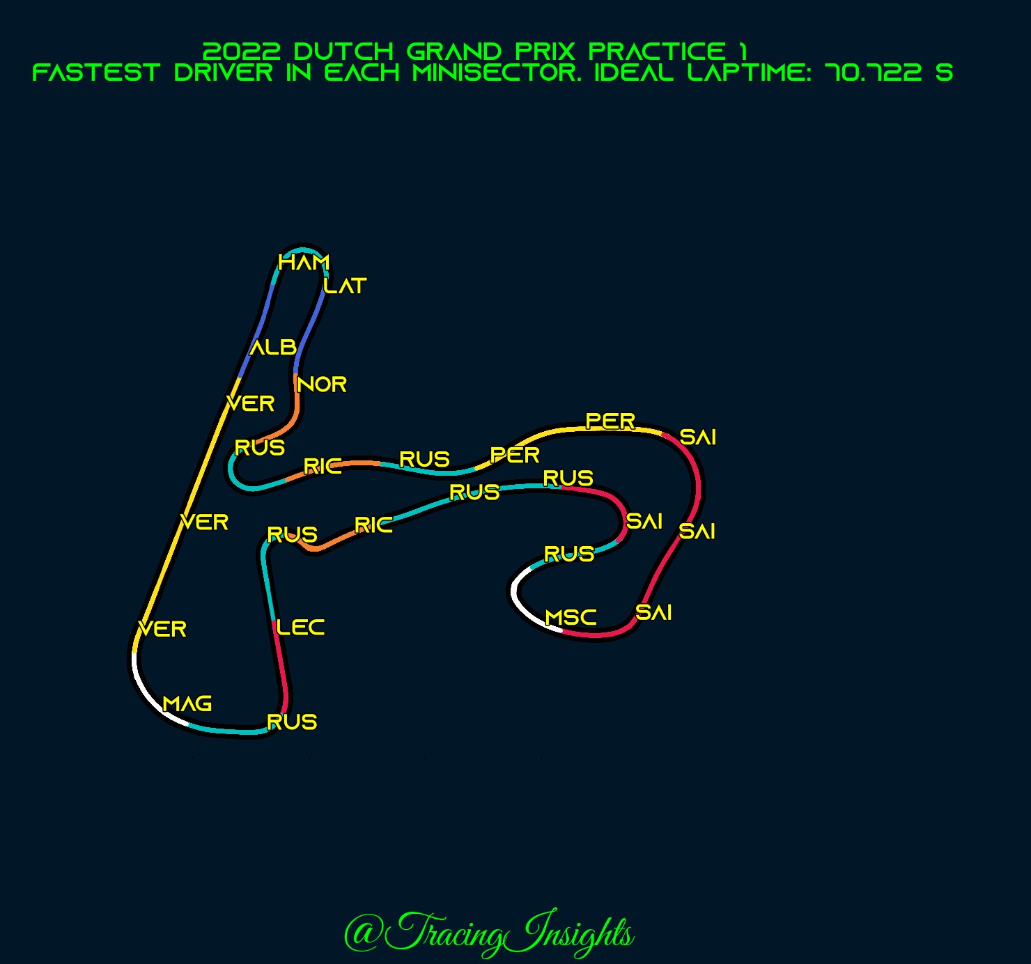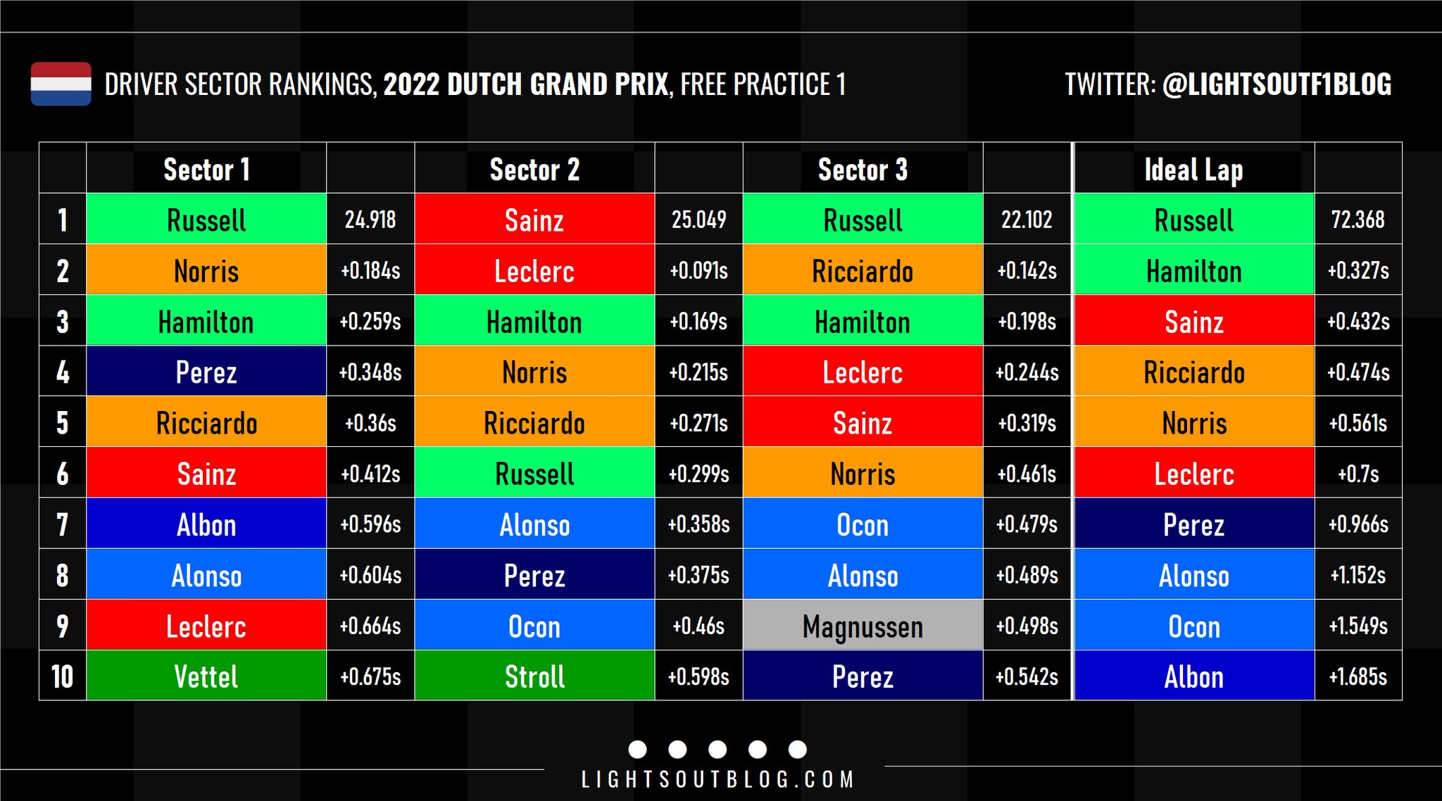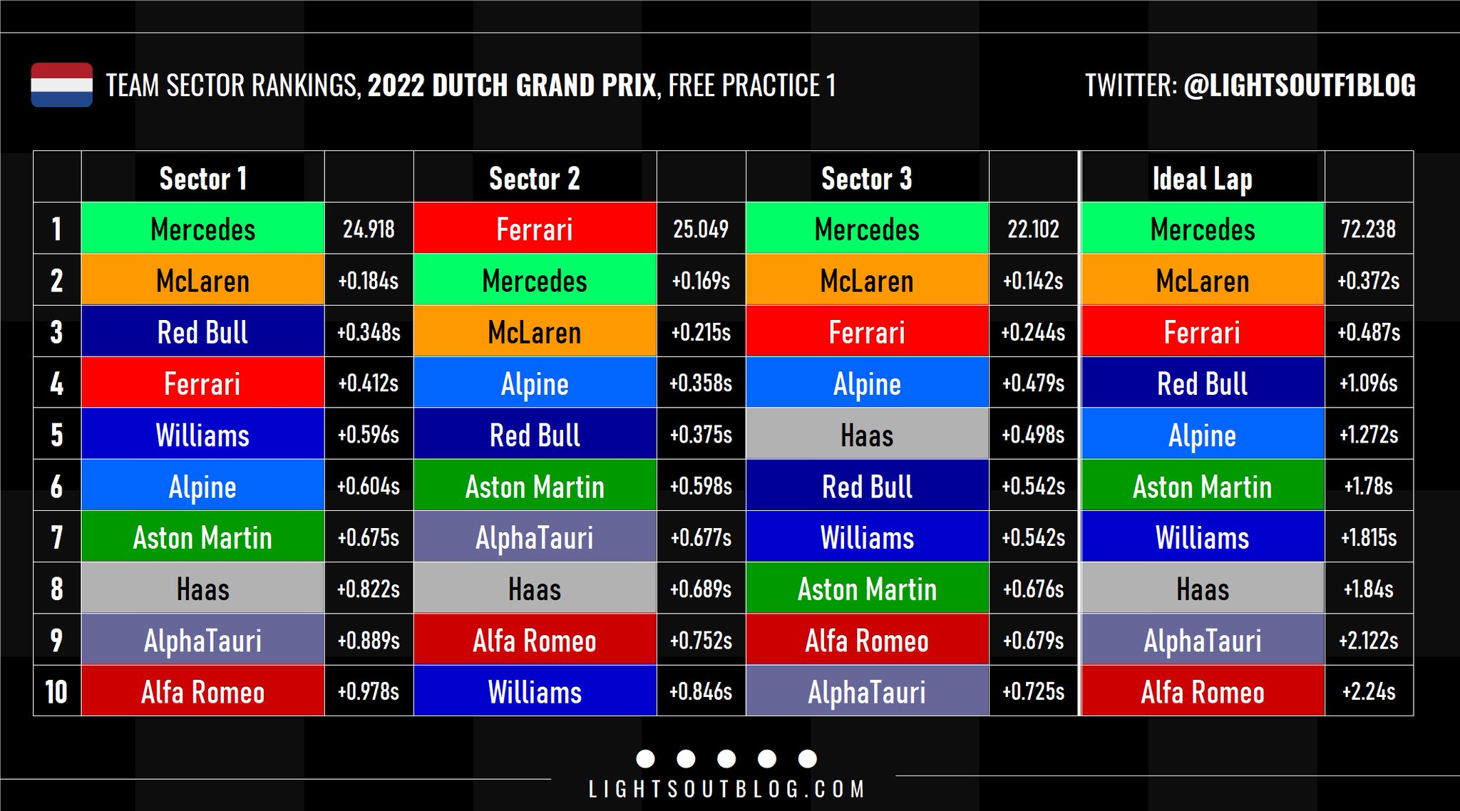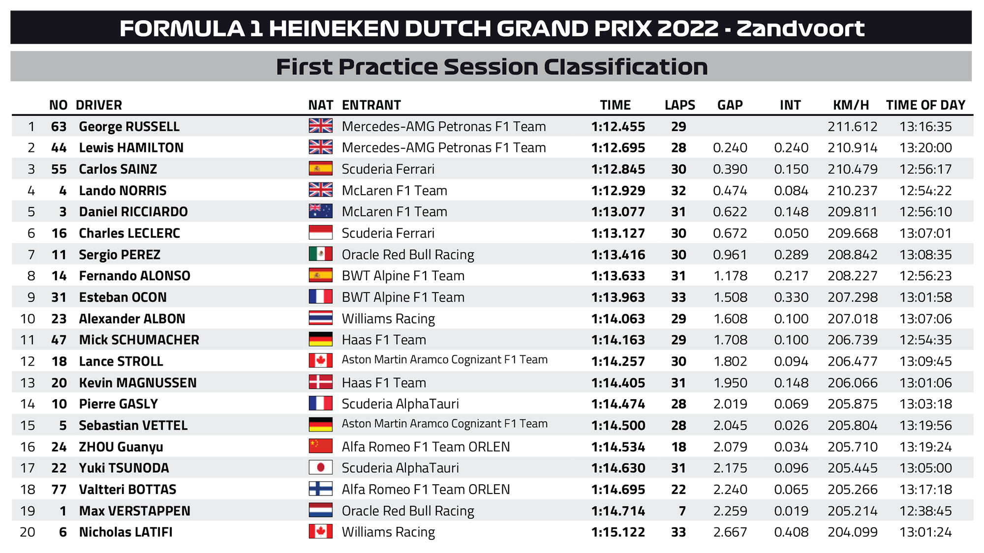 Η Mercedes ξεκίνησε με τον καλύτερο τρόπο το τριήμερο του GP Ολλανδίας, με τον George Russell να σημειώνει τον ταχύτερο χρόνο του FP1, με τον team-mate του, Lewis Hamilton να τον ακολουθεί στην κατάταξη, αλλά με αρκετά μεγάλη διαφορά (0,24 δλ.). Οι δύο οδηγοί της γερμανικής ομάδας ευνοήθηκαν από το γεγονός ότι τοποθέτησαν στα μονοθέσιά τους τη μαλακή γόμα πολύ αργότερα από τους υπόλοιπους, με τις συνθήκες στην αρκετά σκονισμένη πίστα να έχουν βελτιωθεί αρκετά.
